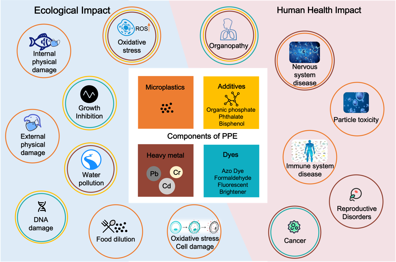 新冠病毒(COVID-19)大流行导致个人防护用品(PPE)的生产量和消费量空前激增。随着全球进入后疫情时代,持续的常态化管理导致PPE的消耗率仍然很高。考虑到与PPE相关的次生环境风险,研究分析PPE对生态系统和人类健康的威胁是十分必要的。这篇综述从全生命周期角度总结了PPE的生产、消费和不当管理,以及PPE主要成分(包括微塑料、金属、添加剂和染料等)对生态系统和人类健康带来的不利影响。PPE生产过程中的主要环境影响是二氧化碳排放、能源消耗和生物多样性丧失。PPE主要成分对生态系统最重要的毒理学影响是氧化应激,其次是生长抑制、DNA损伤和水体富营养化,对人类健康的不利影响主要包括器官损伤、免疫系统损伤、神经系统损伤、致癌作用和生殖障碍。