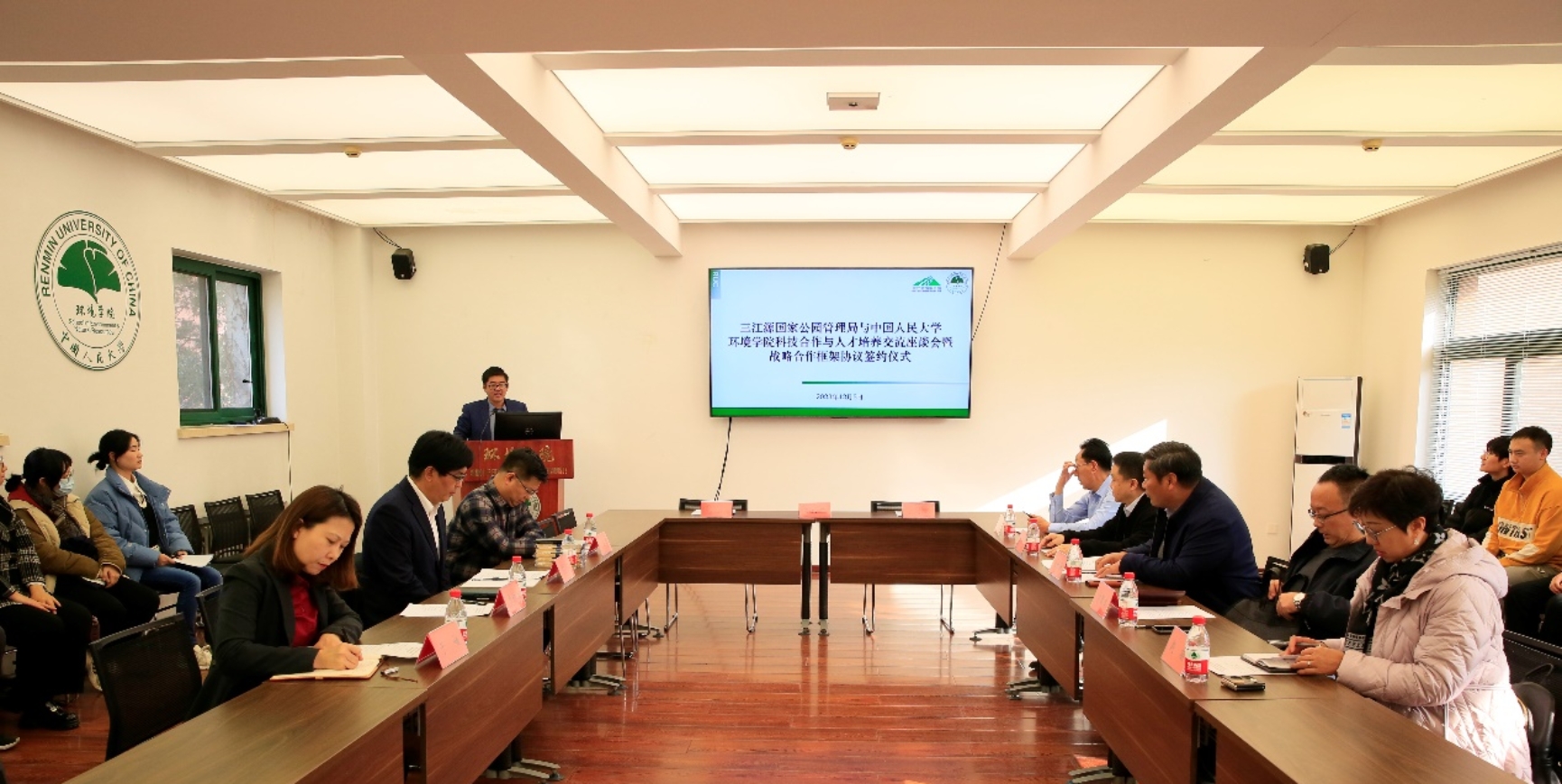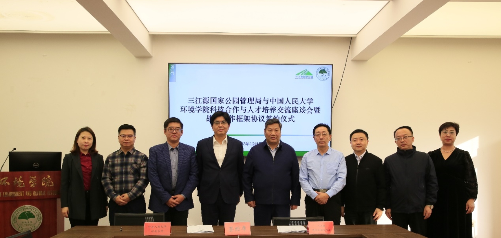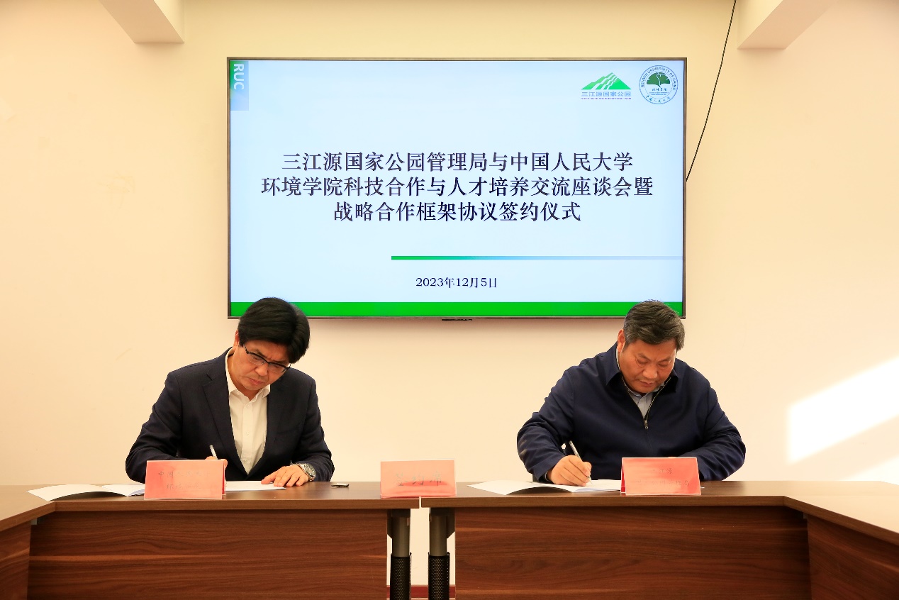 CHAO Shihai introduced the pilot work of Three-River-Source National Park, and said that the administration bureau of Three-River-Source National Park will carry out comprehensive protection ,restoration and governance of the national park ecosystem in accordance with Three-River-Source National Park Master Plan, solidly and orderly promote monitoring and supervision, scientific and technological support, nature experience, harmonious community and other key construction tasks, to realize the unity of ecological protection, green development, and improvement of people’s livelihoods, and strive to make Three-River-Source National Park a shining business card for XI Jinping’s thought on ecological civilization to take root on the Qinghai-Tibetan Plateau. CHAO Shihai expressed his hope that the School of Environment and Natural Resources of Renmin University of China would give full play to its disciplinary, talent and technical advantages, strongly support the work of the administration bureau of Three-River-Source National Park, and take the signing of the strategic cooperation framework agreement as a starting point to create a model of university-local cooperation.During the meeting, the two sides signed the Framework Agreement on Strategic Cooperation between the School of Environment and Natural Resources of Renmin University of China and the Administration Bureau of Three-River-Source National Park. Based on the agreement, the two sides will set up “Renmin University of China-Three-River-Source Science and Technology Cooperation and Social Practice Base” in Three-River-Source National Park. In addition, the two sides will also cooperate to carry out activities such as education and training of cadres and teaching practice for students in Three-River-Source National Park.