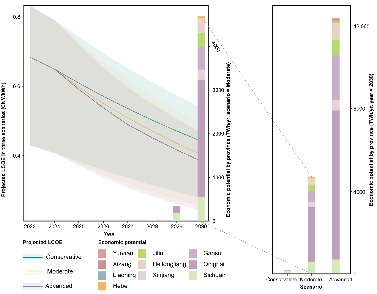 Abstract: We comprehensively evaluate concentrated solar power (CSP) potential in China across four dimensions: geographical, technical, economic, and CO2 mitigation, and extend the analysis from panel to time-series through learning curves and scenario analysis. Evidently, China has substantial CSP potential, with 1.65 million km2 geographical and  142 , 888 TWh/yr  technical potential mainly concentrated in five provinces: Inner Mongolia, Xizang, Xinjiang, Gansu, and Qinghai. The weighted levelized cost of electricity of CSP in China is  0 . 6839 CNY/kWh , which is close to grid parity. Provinces should not uniformly progress. Qinghai and Gansu should act as the pioneers, whereas Xinjiang and Inner Mongolia serve as the backbone of the second tier. The grid connection of all ongoing and planned CSP projects is essential for substantial CSP development in China by 2030. In summary, despite the challenges posed by cost competition and evolving market conditions, with strategic advancements, the Chinese CSP industry is poised for a promising future.