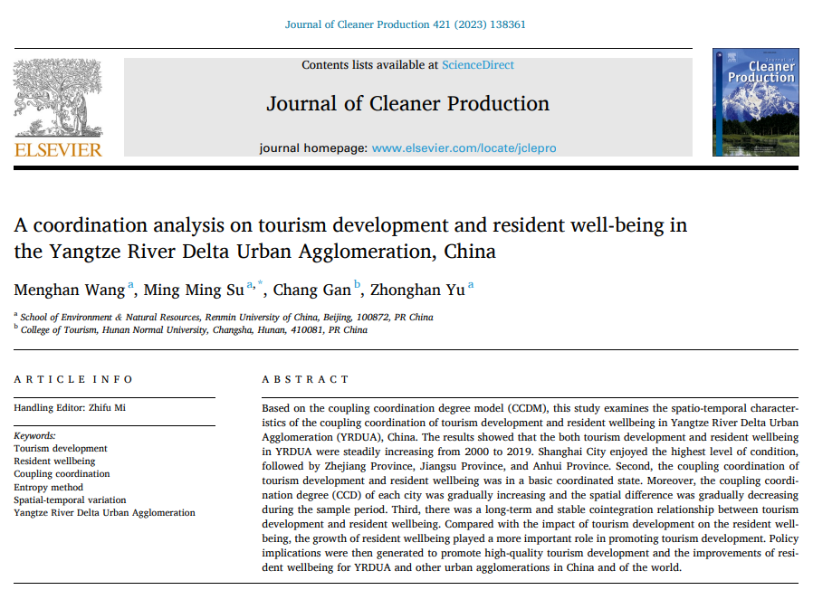Mingming Su et al:A coordination analysis on tourism development and resident well-being in the Yangtze River Delta Urban Agglomeration, China