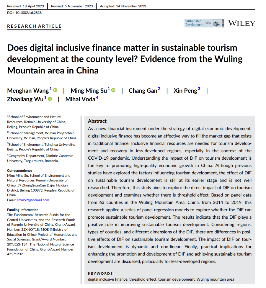 Mingming Su et al:Does digital inclusive finance matter in sustainable tourism development at the county level? Evidence from the Wuling Mountain area in China