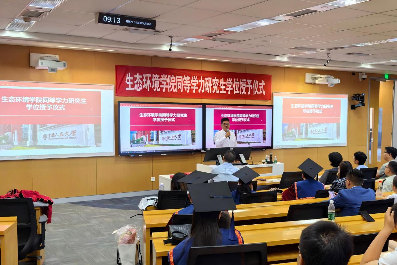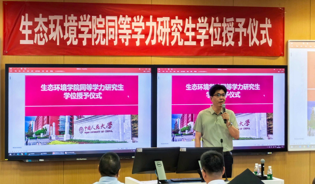 毕业生代表宋思达分享了自己求学之路的感悟。他回顾了入学以来自己克服专业基础薄弱、工作繁忙等困难,利用一切时间学习备考,顺利通过国家考试,并最终获得硕士学位的历程。他向悉心指导自己学位论文的学院老师们表示崇高的敬意和衷心的感谢:“每一处论文批注都是最珍贵的财富。”最后,宋思达引用王安石的诗句“不畏浮云遮望眼,自缘身在最高层”,表达了对学术攀登的坚定信念,并呼吁同学们以所学知识服务可持续发展,做“绿色追梦人”。