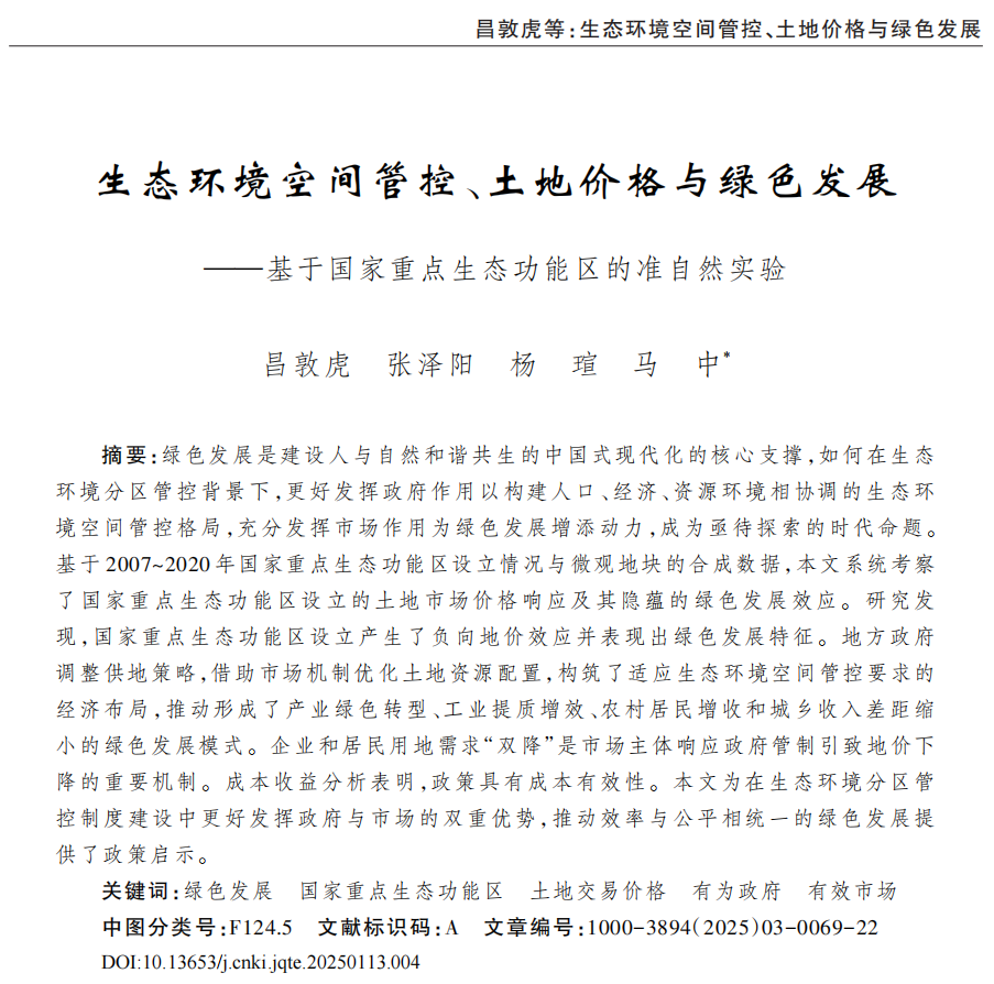 摘要:绿色发展是建设人与自然和谐共生的中国式现代化的核心支撑,如何在生态环境分区管控背景下,更好发挥政府作用以构建人口、经济、资源环境相协调的生态环境空间管控格局,充分发挥市场作用为绿色发展增添动力,成为亟待探索的时代命题。基于2007~2020年国家重点生态功能区设立情况与微观地块的合成数据,本文系统考察了国家重点生态功能区设立的土地市场价格响应及其隐蕴的绿色发展效应。研究发现,国家重点生态功能区设立产生了负向地价效应并表现出绿色发展特征。地方政府调整供地策略,借助市场机制优化土地资源配置,构筑了适应生态环境空间管控要求的经济布局,推动形成了产业绿色转型、工业提质增效、农村居民增收和城乡收入差距缩小的绿色发展模式。企业和居民用地需求“双降”是市场主体响应政府管制引致地价下降的重要机制。成本收益分析表明,政策具有成本有效性。本文为在生态环境分区管控制度建设中更好发挥政府与市场的双重优势,推动效率与公平相统一的绿色发展提供了政策启示。