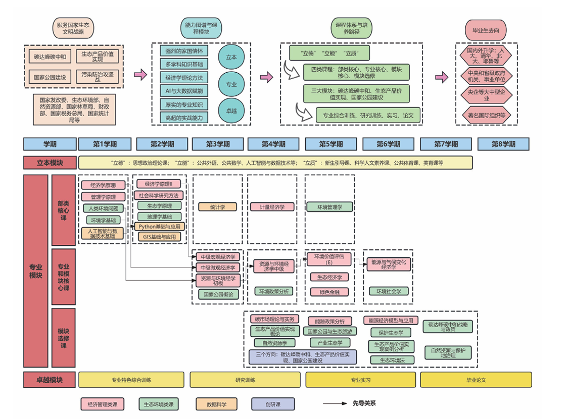 以习近平生态文明思想为指导,依托“双一流”重点建设 A+学科和国家级一流本科建设专业点,本专业旨在培养系统掌握资源与环境经济学学科基础、前沿理论和关键方法,立足中国生态文明建设伟大实践和重大现实问题,具有强烈的家国情怀、厚重的理论素养、宽阔的国际视野、高超的解决现实问题能力的高端复合型经济学人才。本专业严守宽口径、厚基础之原则,注重与环境学、生态学、统计学、数据科学等的交叉共融,培养学生掌握扎实的资源与环境经济学基本理论,掌握现代经济学前沿数量分析方法,使学生形成系统的以经济学为主干的多学科融合的知识结构和思维方式。强调扎根中国大地,注重理论联系实际,聚焦中国碳达峰碳中和、生态产品价值实现、国家公园建设等重点领域,培养学生了解生态文明建设伟大实践,具备扎实的本土知识和敏锐的问题意识,能从专业视角观察、分析和解决现实社会的生态环境问题,能够在国家和地方综合经济管理部门、资源环境管理部门、科研机构、企事业单位从事管理、研究、咨询工作,或者继续攻读相关专业的硕士或博士学位。注重培养学生理论与实践的贯通能力、直面问题的创新能力、具备本土与国际双重视野、能够支撑国家生态文明战略的经济学复合人才,成为德智体美劳全面发展、理论厚实、训练扎实、了解国情、创新包容、活跃于经济社会建设各领域的“复兴栋梁、强国先锋”。