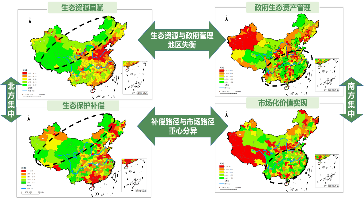指数发布结果显示:中国城市生态资产管理初具成效,各城市在生态资产管理方面区位特征明显,东西部城市各具优势,长江流域城市优于黄河流域,且福建、江西、青海等生态产品价值实现先行试点地区的城市成效较为显著;在政府生态资产管理水平方面,《建立健全生态产品价值实现机制的实施方案》和“生态产品价值实现专项领导小组”是政府实施生态资产管理的关键制度安排,在这两方面落实到位的城市其政府生态资产管理指标得分较高。与此同时,参见图1,我国城市生态资产管理也存在如下问题:生态资源禀赋与政府生态资产管理能力呈现地区失衡现象,西部一些生态资源禀赋丰富的城市其政府的生态资产管理能力却较弱,而东部一些生态资产管理能力较强的城市其生态资源禀赋却相对匮乏;生态保护补偿水平与市场化价值实现能力呈现区域分化,生态保护补偿水平目前主要以西部地区的部分城市得分较高,而市场化价值实现能力则主要是东部和中部地区的部分城市表现更好。