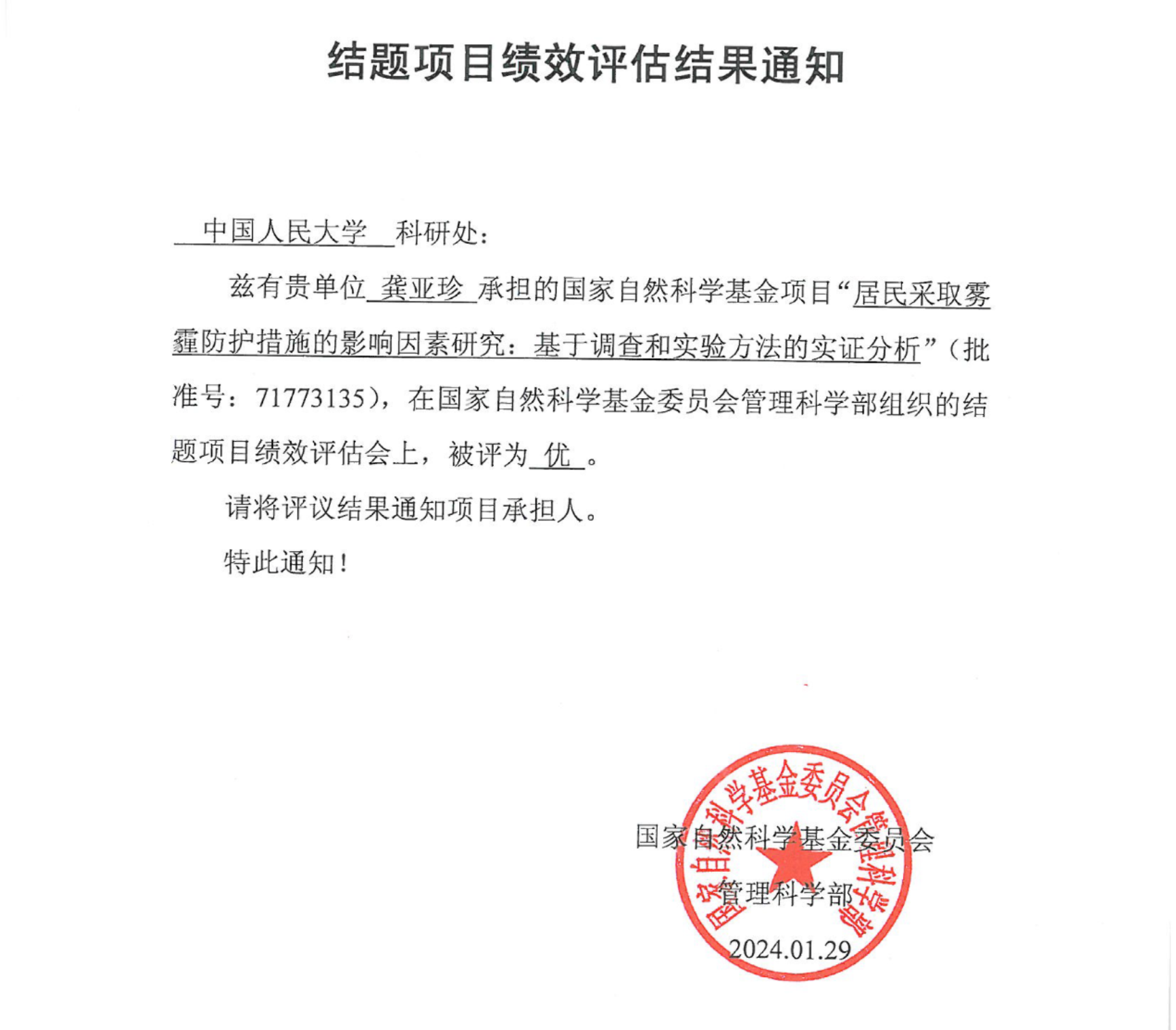 近日,2024年度国家自然科学基金委员会管理科学部组织的结题项目绩效评估会结果已公布,由色情动漫 龚亚珍教授承担的国家自然科学基金面上项目“居民采取雾霾防护措施的影响因素研究:基于调查和实验方法的实证分析”(批准号:71773135),被评为“优”。