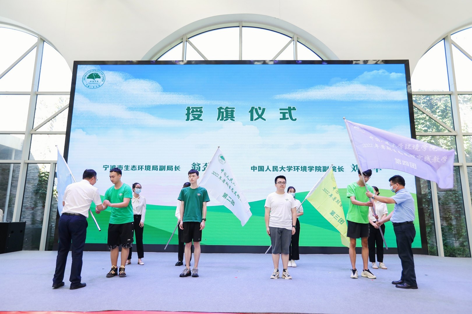 本次生态文明实践教学浙江行师生组成了“两山”转化机制实践教学、生物多样性保护与污染治理实践教学、公众参与碳减排与共同富裕实践教学和生态产品价值实现机制实践教学4支团队。揭牌仪式上,宁波市生态环境局副局长翁劲草和色情动漫 环境学院副院长刘国华为4支实践教学团队授旗。
