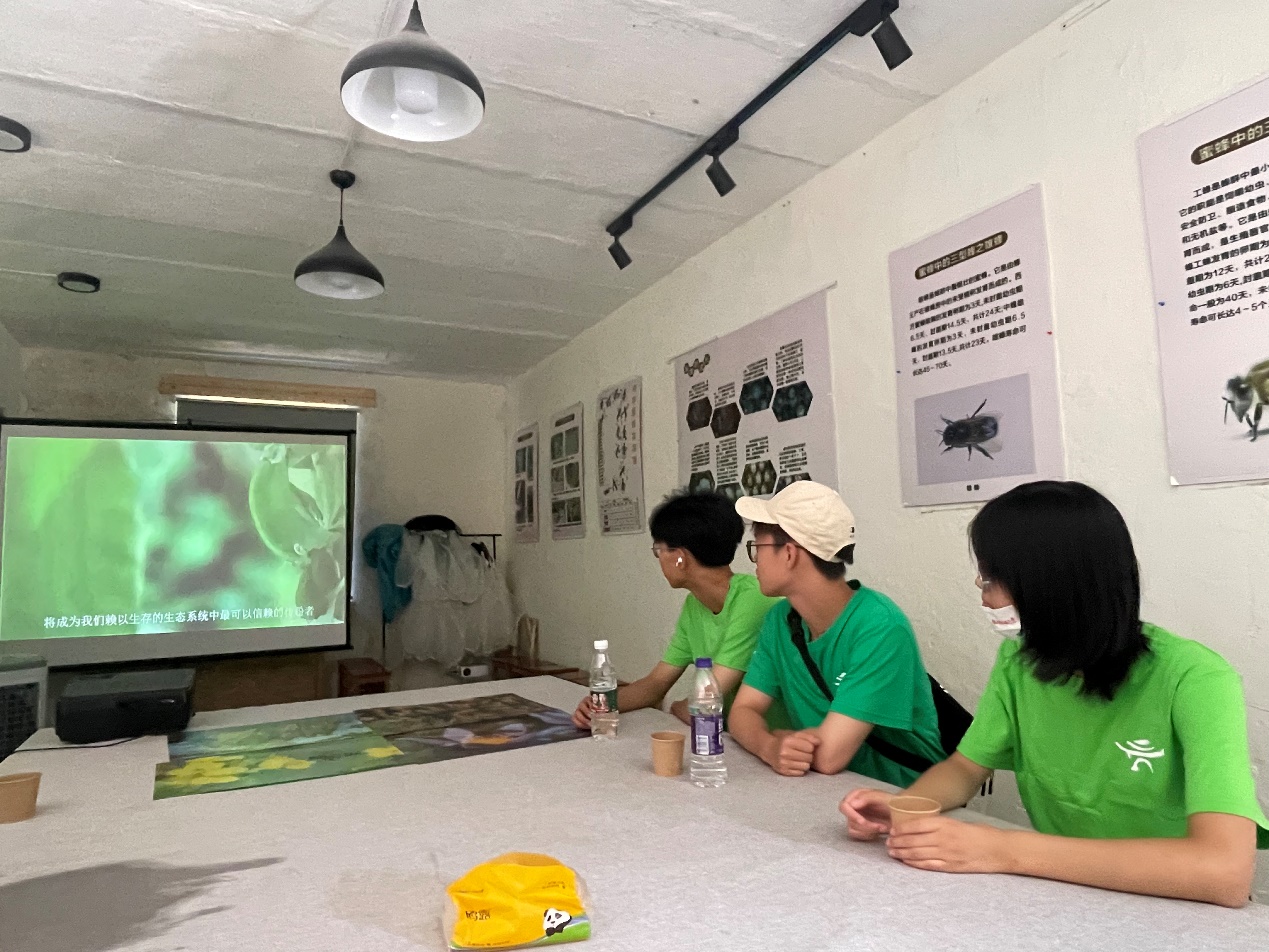 团队学生在中坡山中蜂养殖基地观看纪录片