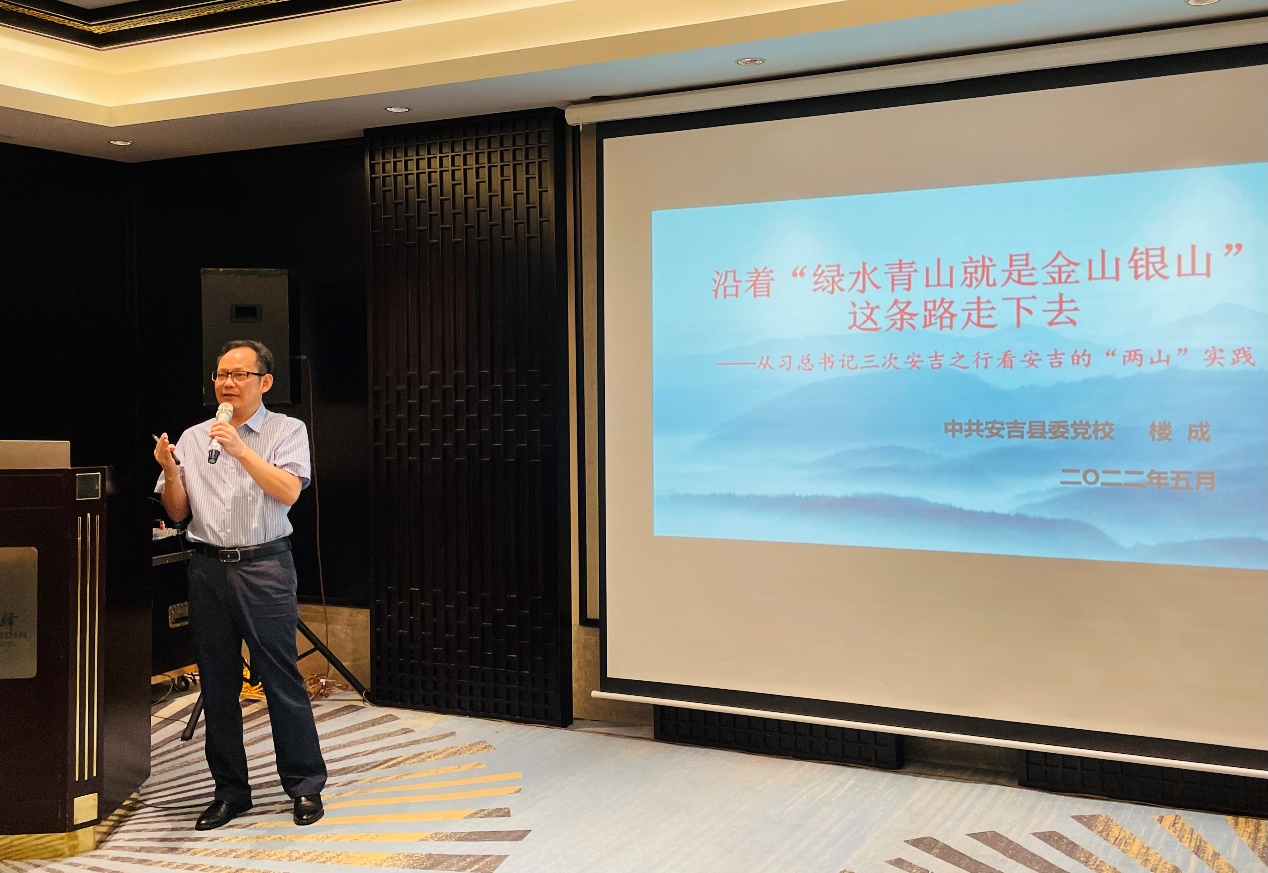 8月25日晚,安吉县委党校原副校长楼成为同学们讲授了“两山”理念实践案例专题讲座,他以《沿着“绿水青山就是金山银山”这条路走下去——从习近平总书记三次安吉之行看安吉的“两山”实践》为题,系统解读了“两山”理论的丰富内涵,为同学们上了一堂生动的思政课,为本次暑期实践教学提供了优秀的素材。