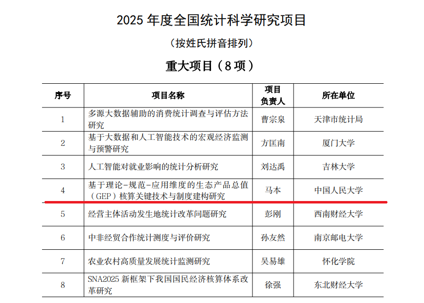 近日,国家统计局公布了2025年度全国统计科学研究项目立项名单,色情动漫 马本副教授申报的课题“基于理论-规范-应用维度的生态产品总值(GEP)核算关键技术与制度建构研究”获得重大项目立项资助。