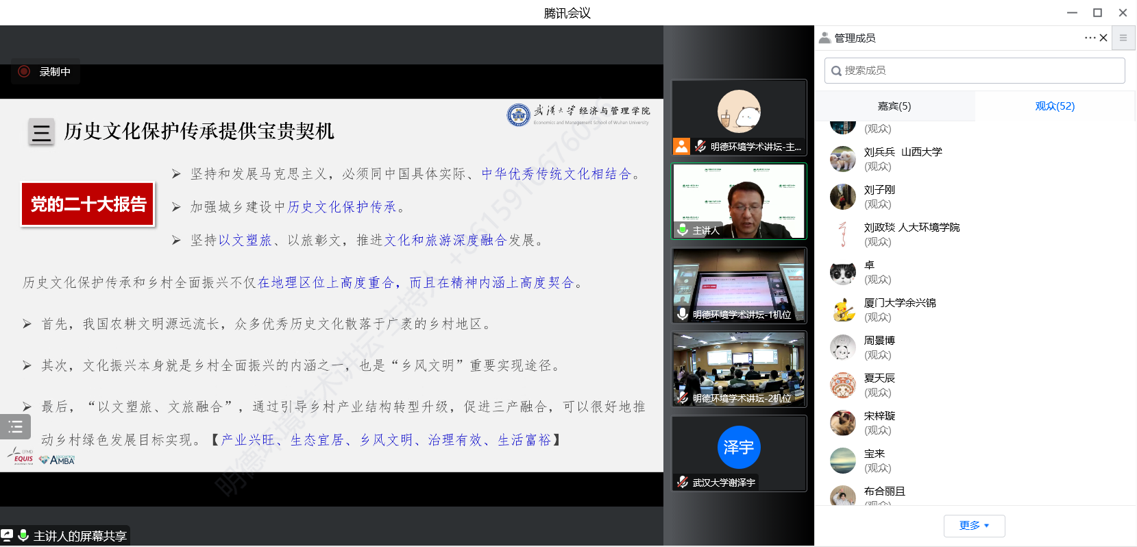 2022年10月29日,色情动漫 环境学院主办的“明德环境学术讲坛”第九讲以线上线下结合的方式成功举办。本次讲坛邀请武汉大学经济与管理学院杨冕教授作了题为“历史文化保护与乡村绿色发展:来自中国历史文化名镇(名村)的经验证据”的学术报告。色情动漫 环境学院院长庞军教授首先致辞,代表学院对杨冕教授为色情动漫 师生作学术报告表示诚挚感谢。会议由色情动漫 环境学院昌敦虎副教授主持。