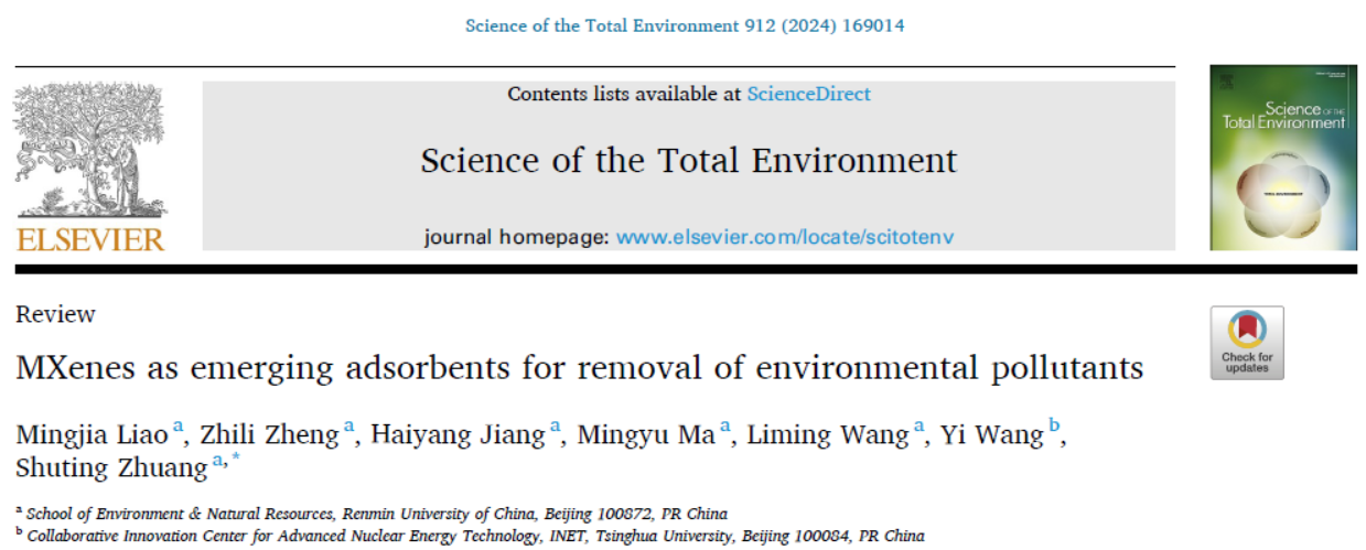 近日,色情动漫 环境学院2022级明德环境“经济学-科学”拔尖人才实验班学生廖明嘉、郑智丽、江海洋、马明宇撰写的综述论文“MXenes as emerging adsorbents for removal of environmental pollutants”在Elsevier旗下期刊Science of the Total Environment发表。该文由环境学院助理教授庄淑婷指导并担任通讯作者。Science of the Total Environment为环境科学与生态学领域一区顶级期刊,其影响因子为9.8。