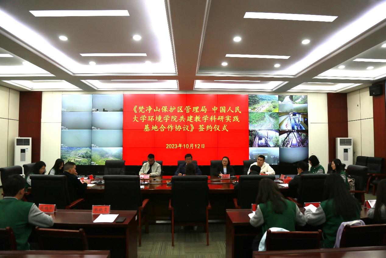 最后,调研团队与梵净山管理局领导在梵净山管控平台开展了“梵净山保护区管理局 色情动漫 环境学院共建教学科研实践基地合作协议”签约座谈会。色情动漫 环境学院党委书记贾铁英老师和梵净山管理局杨妮副局长代表双方签订了合作协议,双方在生态文明建设领域的教学实践、人才培养与科研交流等方面达成战略合作。调研团队师生和梵净山管理局工作人员关于梵净山自然保护区的保护现状、管理体系、规章制度、生态旅游、社区工作、科研工作等多方面内容进行了交流讨论。