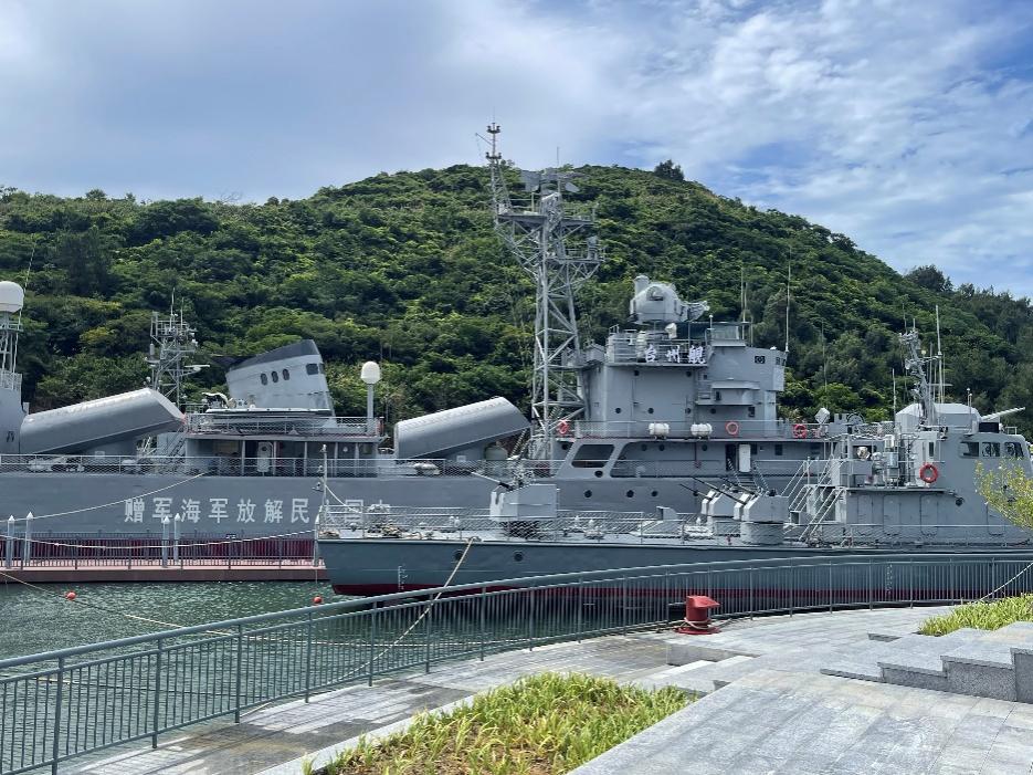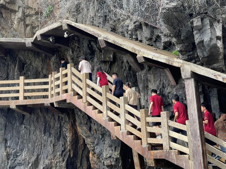 在乌沙头栈道,调研组实地感受了上大陈岛生态旅游发展成果。这条依山傍海的观光栈道,不仅为游客提供了欣赏海岛风光的绝佳视角,更体现了当地在开发建设中坚持生态优先、绿色发展理念。最后,调研组来到军事文化基地,登上中国人民解放军捐赠的“台州舰”进行参观。