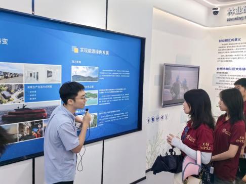 一路走来,大陈岛渚湾已跃身成为国家第三批美丽海湾优秀案例,以全新面貌展现于国家绿色低碳的发展蓝图中。在海洋蓝碳展厅,调研团师生与工作人员进行了深入交流,了解了大陈岛推进实现“双碳”目标的成果与经验。自2022年以来,大陈岛加快打造碳中和示范岛,不断加强海洋碳汇、陆地碳汇理论研究,大力推动低碳固体废物处置、全电交通等低碳生产生活方式落实,开展了柔性低频输电示范工程建设、“海岛碳汇+”公益诉讼等绿色实践措施,为美丽海湾建设提供了新思路、新方法、新模式。