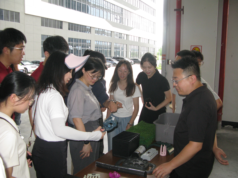 随后,调研团一行来到沃府新材料有限公司(后简称“沃府”)。相比于其他回收企业,沃府企业规模大,产业链长、产品品类多样。从塑料回收、破碎、造粒、改性再到配件生产,沃府每个环节都可以利用自己的生产线完成。据工作人员介绍,沃府的原料来源已经覆盖浙江、福建、海南等多地,形成了成熟的收集链条;而在后端,其也凭借汽车配件、家电配件的定制化生产实现了回收塑料的高值利用。