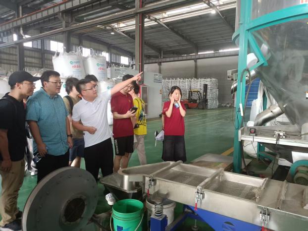 下午,调研团来到台州齐聚再生资源有限公司进行参观。齐聚以推动废弃物的再生利用、为环保事业作出贡献为使命,打造了“国内收集+国际OBP标准认证+国际市场溢价销售”的市场循环模式。在生产车间,轰鸣的机器将塑料废物转变为再生粒子,仅需要少数人管理,展现出现代塑料再生利用企业从劳动密集型向资本密集型的转变。