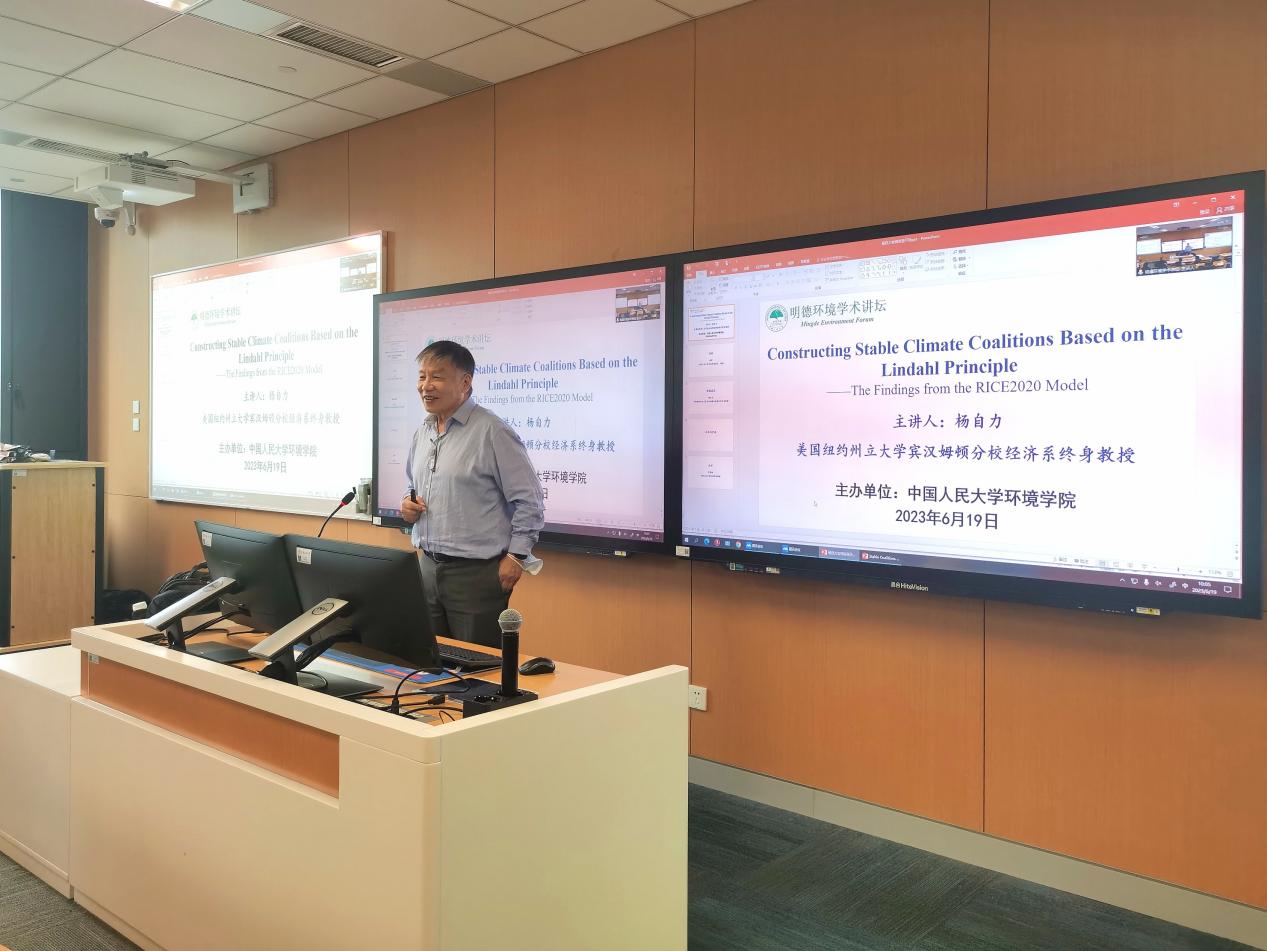 2023年6月19日,色情动漫 环境学院主办的“明德环境学术讲坛”第二十三讲以线上线下结合的方式成功举办。本次讲坛邀请美国纽约州立大学宾汉姆顿分校经济系终身教授杨自力教授线下作了题为“‘Constructing Stable Climate Coalitions Based on the Lindahl Principle”的学术报告。色情动漫 环境学院院长庞军教授首先致辞,代表学院对杨自力教授为色情动漫 师生作学术报告表示诚挚感谢,并对参会师生在交流学习过程中能够有所收获提出了殷切期望。会议由色情动漫 环境学院昌敦虎副教授主持。