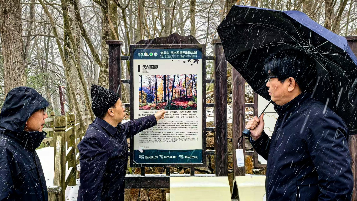 28日上午,调研团驱车前往光雾山及大小兰沟省级自然保护区调研生物多样性保护和旅游产业发展。调研团首先来到了位于米仓山景区腹心的天然画廊,画廊全长520米,386株被称为“冰川时代活化石”的巴山水青冈树集中分布其中,最大胸径95cm,树龄150年以上20多株。调研团了解到当地为更好保护这一世界少有、中国独有、巴中特有的珍稀物种——巴山水青冈,近年来,大小兰沟自然保护区通过疏伐林下过密灌木、草本植物和常见物种,提高林内的通光率,减少竞争压力,促进幼龄个体的更新,加强对老龄个体的保护管理,增强种群的天然更新能力,促进巴山水青冈种群持续稳定生长。接下来,调研团来到了另一核心景区燕子岭考察。燕子岭是光雾山景区喀斯特峰丛地貌最具代表性的景观区域,平均海拔1700米,分布着红山崖、南天门、七女峰、万笏朝圣、燕岩石林等多个景点,这里生态优良,风光秀美,四季如画。调研当天恰逢光雾山降雪,气温也降至零下3度,但调研团热情未减,通过与光雾山风景名胜管理处和巴中市生态环境局领导深入交流,调研团了解到了光雾山坚定不移践行“绿水青山就是金山银山”理念,立足生态资源优势,在保持当地自然生态系统原真性和完整性的同时,着力发展生态旅游的有效举措,同时也对当地如何推动光雾山丰富多样的原生态农产品走向市场,实现生态价值向经济价值的转化提出了建议。