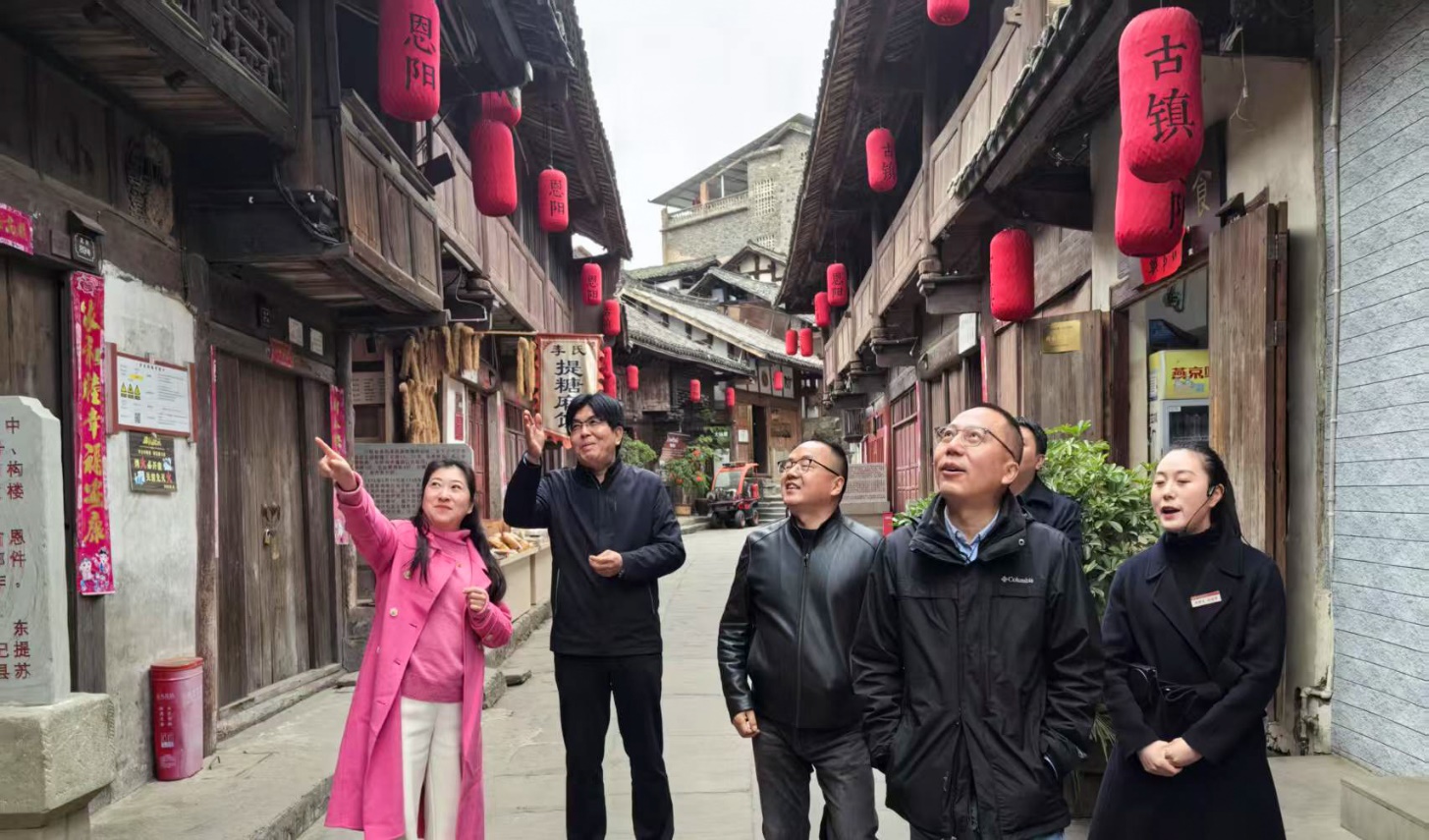 28日下午,调研团来到被称为“巴蜀文化旅游走廊新地标”的恩阳古镇调研。恩阳古镇位于四川省巴中市恩阳区文治街道,是国家AAAA级旅游景区。历经1500余年历史,现有18条古街巷,589栋明清古建筑,曾是米仓古道上最繁华的集镇,是川东北重要水码头和物资集散中心。1933年至1935年,红四方面军先后设仪阆县、恩阳县,留下的川陕苏区唯一列宁模范学校走出了张思德等革命先辈,现存红军经理处、革命法庭等众多革命旧址,是川陕苏区保存最完整的县级苏维埃政权旧址群。恩阳古镇聚焦“茶馆子、戏窝子、饭堂子”建设目标,依托米仓文化街,恢复古镇市井生活气息,复原米仓古道上茶馆子生活场景,打造川东北最大滨河露天坝坝茶馆,依托文创集市,集中保护展示皮影戏、蓝印花布、竹编等非遗文化。依托万寿宫、河派川剧戏楼广场建设川北灯戏传承体验中心,打造集川剧展示展演、文化传承、沉浸体验为一体的综合文化活动空间,常态化开展川剧、皮影等主题展演活动。恩阳古镇在保护红色文化遗产,传承历史文脉,赋能文旅融合发展,促进当地经济发展方面取得了显著成效。