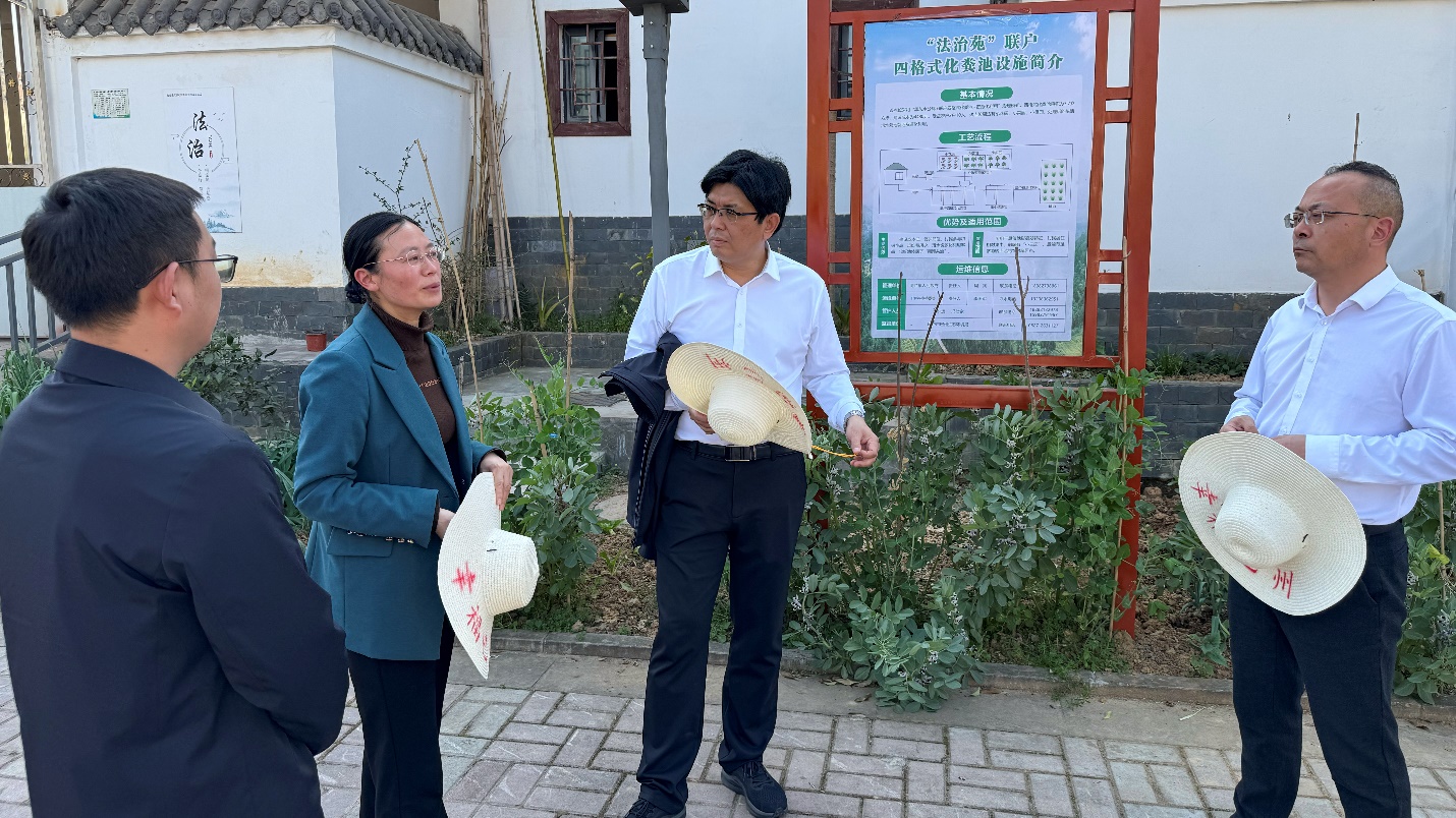 随后,调研团来到巾字村调研农村环境整治。该村针对山区特点,秉承“分散处理、就地回用”的治理思路,建设了8套微型污水处理设施。村支书介绍称,村里的污水处理设施采用“三格化粪池+灰黑水分离”技术,处理后的水质符合农村生活污水排放标准,全部用于农田灌溉和景观用水。具体而言,该技术首先通过三格化粪池进行初步沉淀和厌氧发酵,随后通过灰黑水分离系统将生活污水中的灰水(洗涤用水)和黑水(厕所污水)分别处理,最后经过人工湿地进一步净化。处理后的水质达到国家《农村生活污水处理设施水污染物排放标准》(GB18918-2002)一级B标准,可直接用于农田灌溉和景观用水。同时,通过建立“村民付费、集体补贴、财政奖补”的运维机制,确保设施长效运行,为山区农村污水治理提供了可复制、可持续的解决方案。