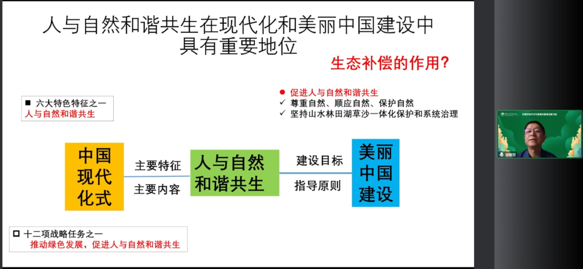 曾贤刚教授发表题为“生态产品价值实现机制与路径”的学术报告。曾贤刚教授从生态产品的概念和特征入手,从政府、市场、“政府+市场”以及社会四个方面深入探讨了不同的生态产品价值实现机制与路径,并且通过具体生动的案例详细解释了各种生态产品价值实现机制的具体特点和经验启示。