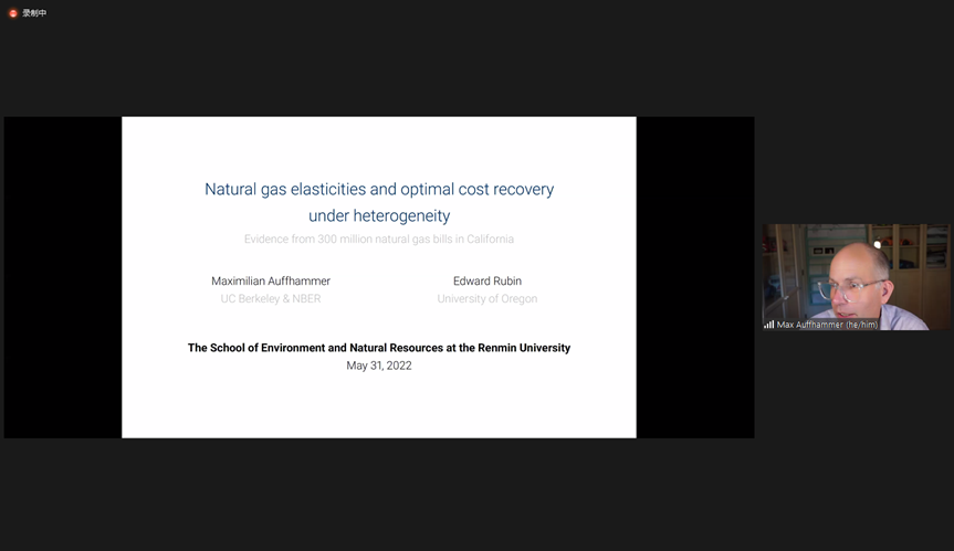 2022年6月1日,色情动漫 环境学院“名家讲坛—资源与环境经济学系列讲座”第二讲以在线方式成功举办。第二讲的报告人是加州大学伯克利分校社会科学院副院长、国际可持续发展专业Maximillian Auffhammer教授。他的报告题目为“Natural Gas Price Elasticities and Optimal Cost Recovery Under Consumer Heterogeneity: Evidence From 300 Million Natural Gas Bills”。