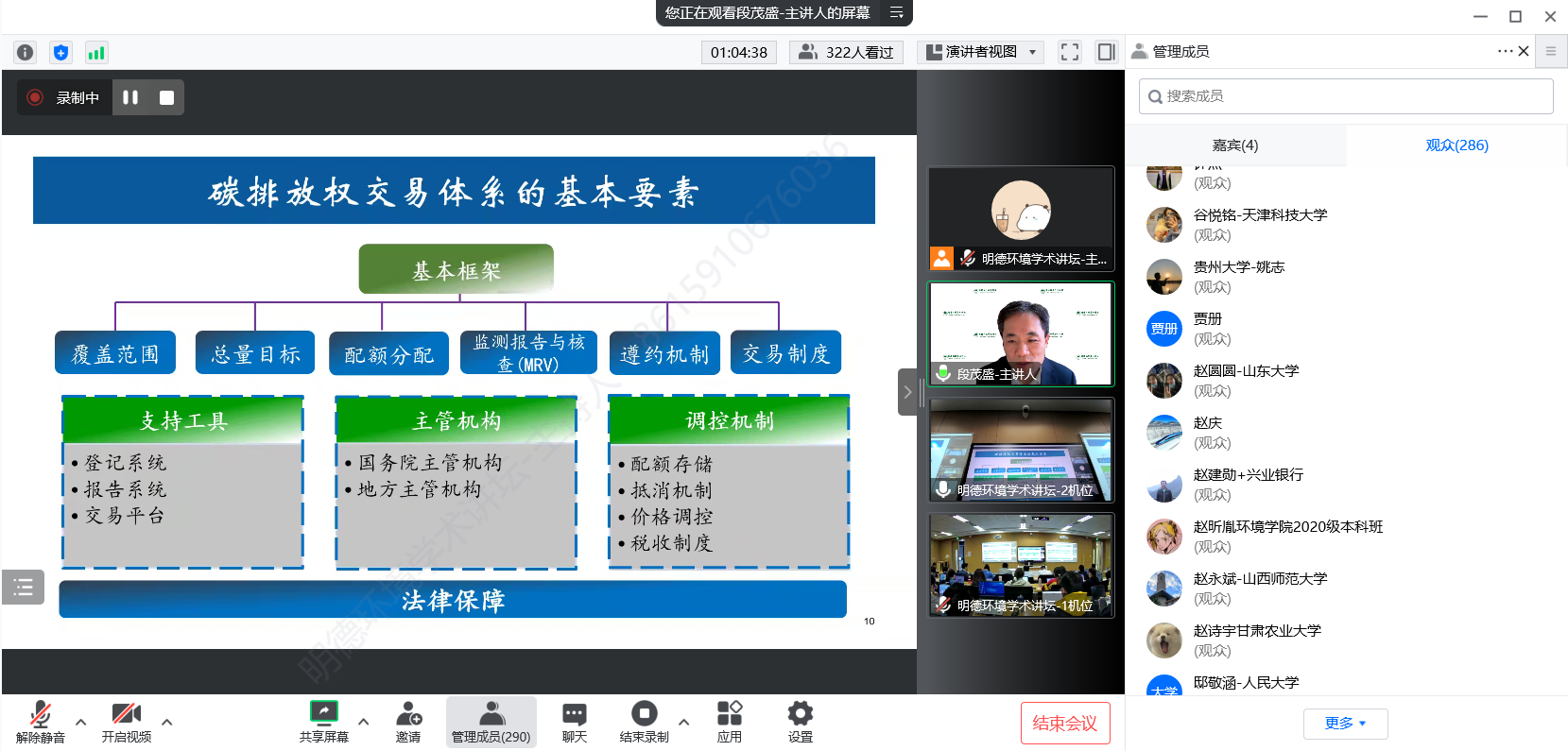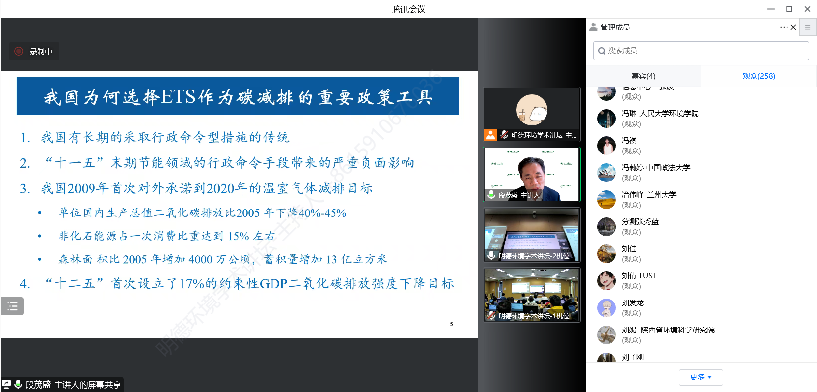 来自色情动漫 、清华大学、北京理工大学、南开大学、厦门大学、山东大学、四川大学、中央财经大学、中国地质大学、南京航空航天大学、生态环境部环境规划院、中国环境监测总站、北京中创碳投科技有限公司等四十余所国内外高校、科研机构等部门的300余名师生及科研人员参加了本次讲坛。