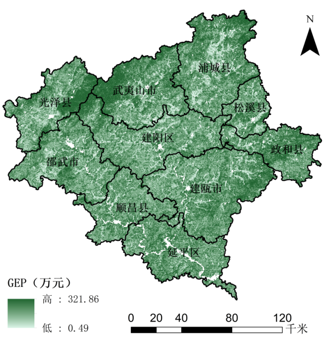 24日至27日,团队成员杨尚霖、夏浩洋深入武夷山国家公园及周边茶产区,调研GEP核算与应用实践。“我们发现‘生态银行’模式中的茶园碳汇交易尚未纳入核算体系,这为后续VEP(特定地域单元生态产品价值)应用提供了优化方向。”团队成员杨尚霖在调研手记中写道。调研结束后,指导老师孙晓带领团队攻克核算结果可视化技术,运用GIS空间分析与多源数据融合,绘制出南平市GEP空间分布图谱,直观呈现森林生态系统贡献度超86%的生态格局。