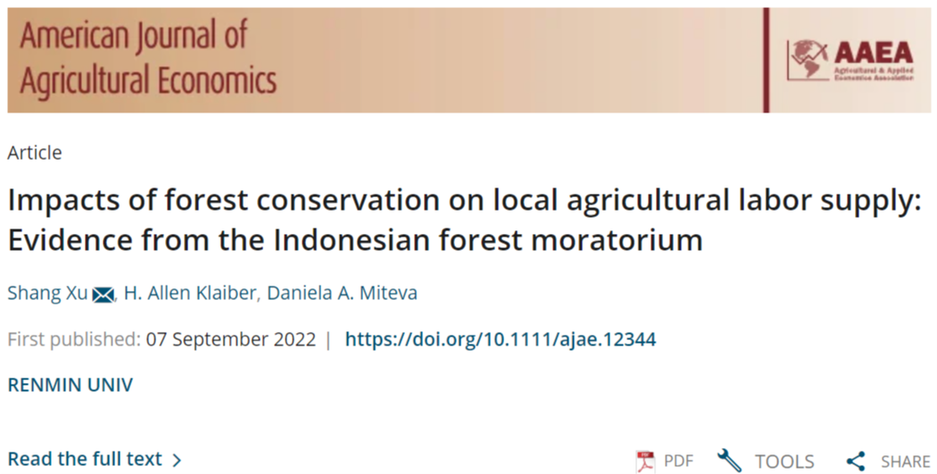 环境学院助理教授徐上以第一作者身份在环境经济学领域权威期刊American Journal of Agricultural Economics上发文