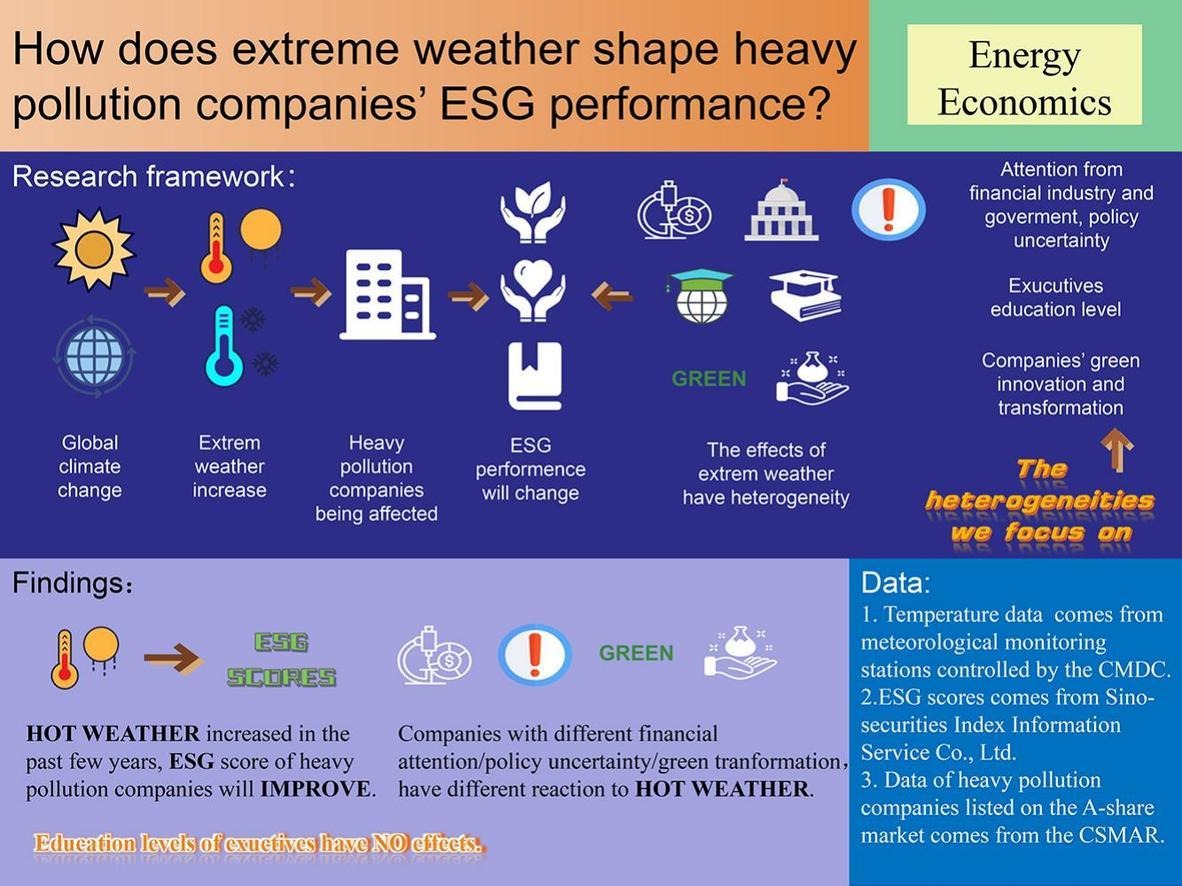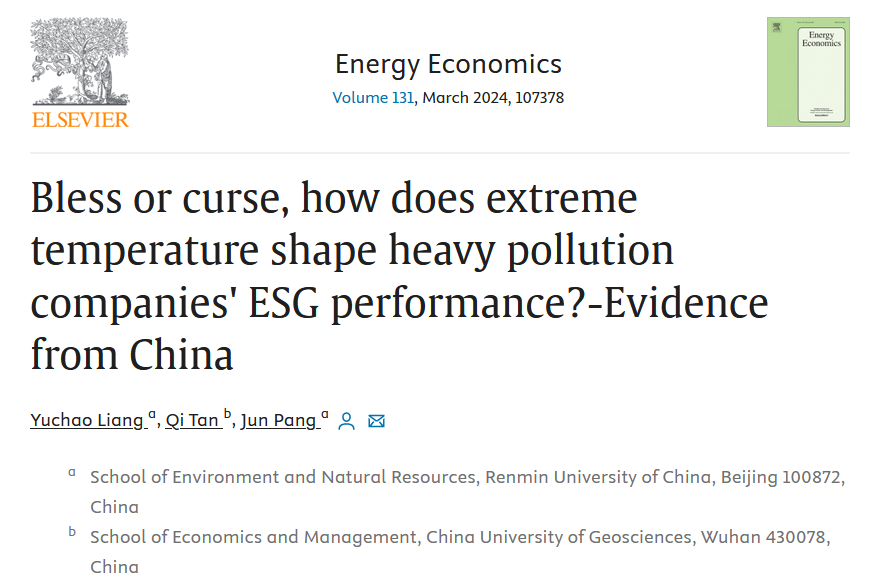 近日,环境学院博士研究生梁宇超在能源经济学领域国际权威期刊Energy Economics发表学术论文。该论文题为“Bless or curse, how does extreme temperature shape heavy pollution companies’ ESG performance?-Evidence from China”。色情动漫 环境学院为第一作者单位,人口、资源与环境经济学2022级博士研究生梁宇超为第一作者,环境学院庞军教授为论文通讯作者。