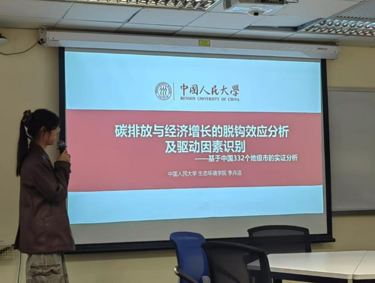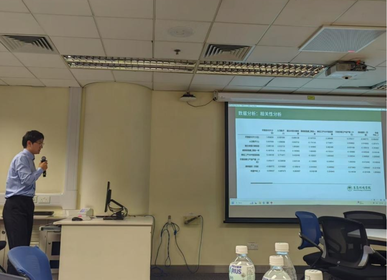 李卉洁同学汇报了碳排放与经济发展脱钩的驱动因素研究。她发现中国整体上在波动中逐步实现了碳排放与经济发展的脱钩,但脱钩效应在城市间具有较强的区域异质性。