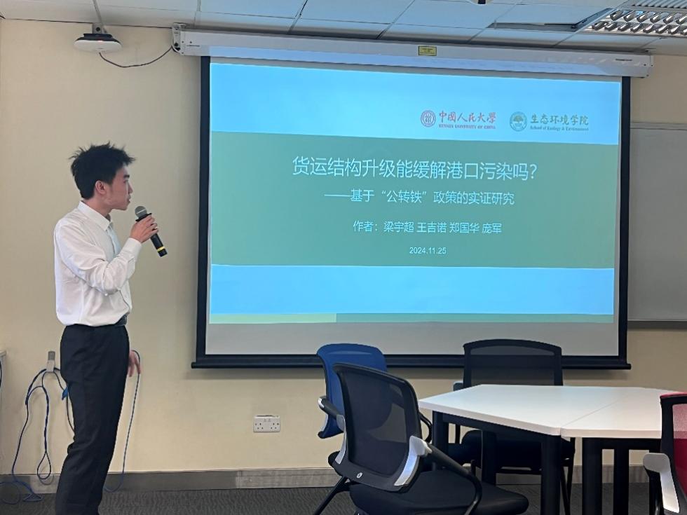 王吉诺同学介绍了环渤海地区货运结构变化对空气污染的改善效应。他的研究使用断点回归和广义DiD方法,结果表明“公转铁”政策的实施有效降低了空气污染水平,政策收益高于政策成本。