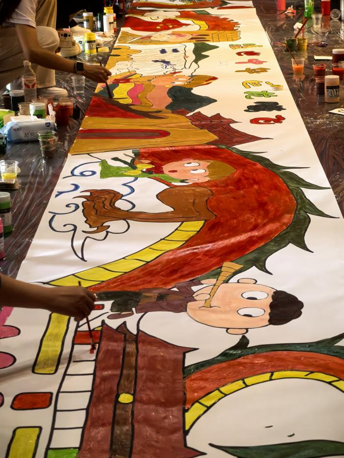 实践团前往鄂尔多斯文化产业园参观调研,并观摩《凤鸣九曲》大型民族主题表演。舞者以巨型鼓面为舞台,伴随恢弘鼓乐腾跃起舞,通过动态视听语言再现鄂尔多斯“神鸟降临”的神话史诗,展现北疆大地生态与人文交融的壮丽图景。剧中“凤凰浴火重生”的意象,更隐喻着草原民族坚韧不息的精神传承。 鼓乐与群舞的交响,不仅是艺术盛宴,更是传统文化生命力的澎湃表达。在文化产业园调研时,实践团还与来自重庆的100名青少年齐聚文化产业园,共同完成“各民族同画一幅画”主题活动。蒙汉双语志愿者引导两地青年分组协作,以“中华巨龙腾飞”为主题创作长卷。一幅幅充满想象力的笔触,勾勒出各族青少年对民族交融、山河一体的美好憧憬。