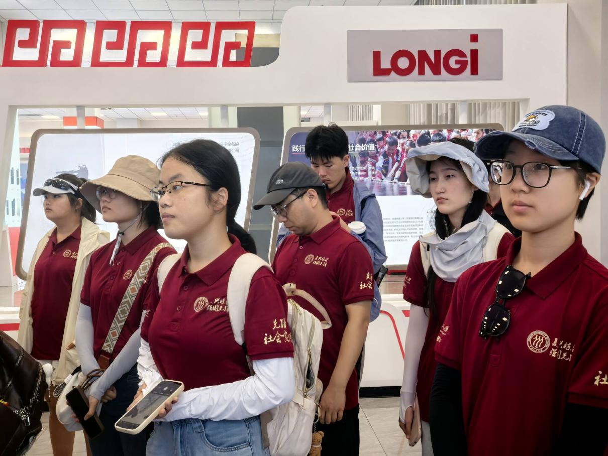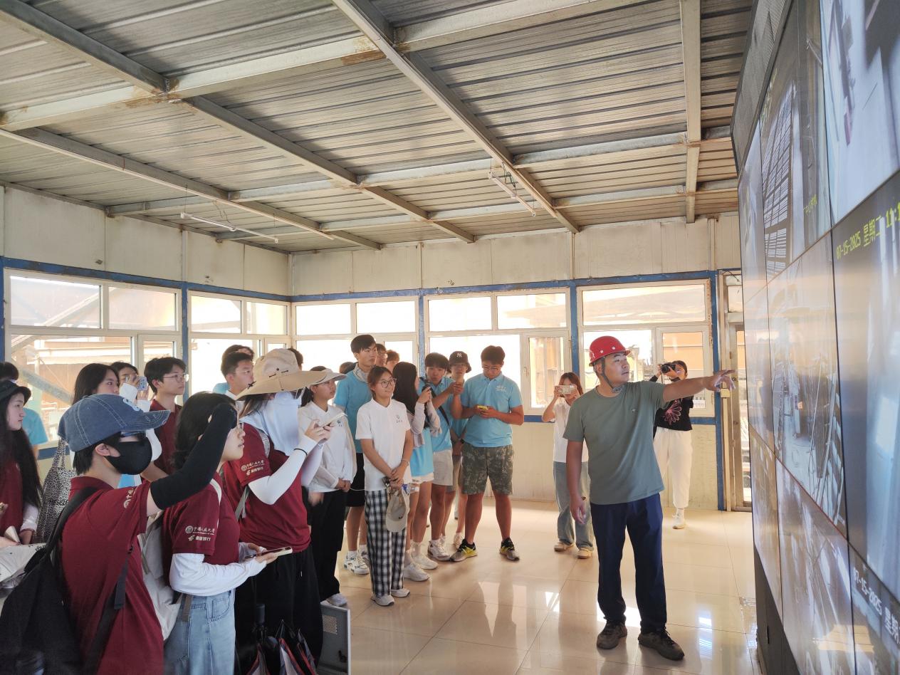 调研团师生奔赴位于鄂尔多斯市的零碳产业园项目。当硅能源被发现,人类开始了光能转化的旅程。隆基绿能以科技创新,不断引领太阳能技术革新。2022年,其自主研发的硅异质结电池转换效率达26.81%。同时,隆基普及金刚线切片技术,每年为中国光伏产业节省30%的硅原料。在自由观摩交流环节,师生们就工艺创新成果等关键技术细节与园区技术人员进行了热烈探讨。该产业园作为区域绿色转型的核心引擎,其推动产业升级、实现经济与生态双赢的实践模式,为调研团理解“双碳”目标下的高质量发展提供了宝贵样本。
