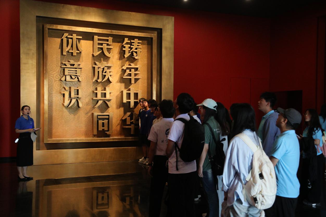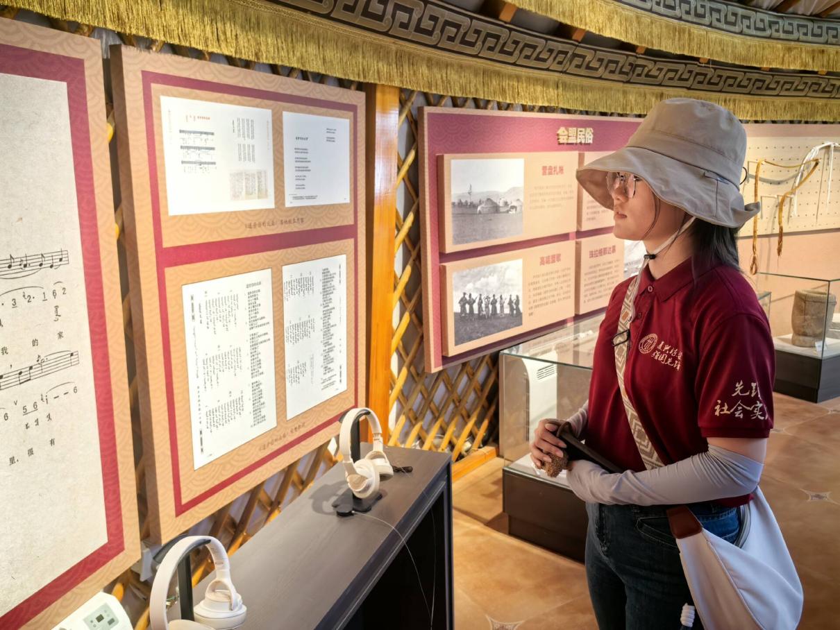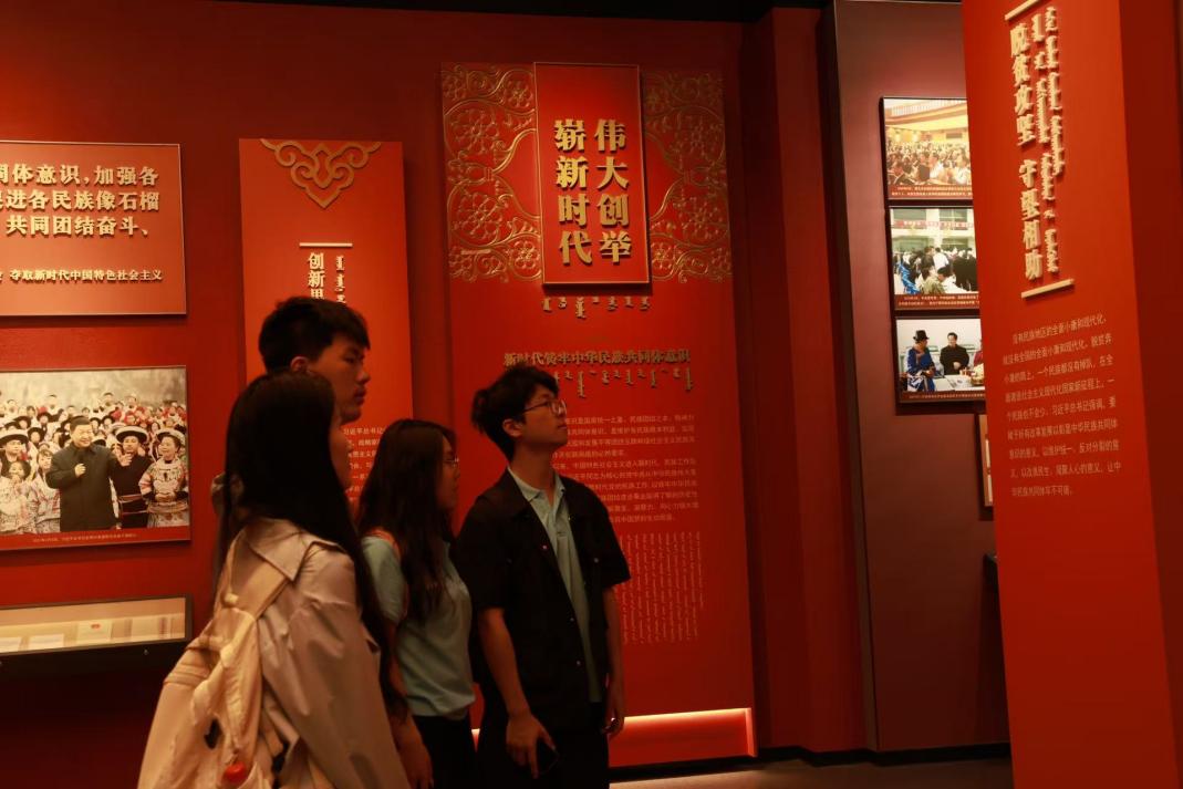 在苏布尔嘎非遗嘎查,调研团深入探访了内蒙古规模最大的民族团结主题教育实践基地。3600平方米的沉浸式展厅内,师生们通过微缩模型、全息影像史料等载体,系统追溯了中华民族“多元一体”的历史脉络。展览馆负责人强调:“我们以科技赋能历史叙事,用文物实证交融史话,让共同体意识可感可触。”展览馆以历史厚度串联起草原丝路交融史、革命斗争红色记忆、毛乌素治沙奇迹等本土篇章。以历史深度铸牢思想根基,以技术维度创新宣教模式,以实践广度联结时代发展,正成为内蒙古深化民族团结、赓续中华文脉的“精神坐标”,为新时代共同体建设提供了鲜活范本。通过讲解和参观,师生党员、团员都对民族团结有了更加深刻的认识和理解。