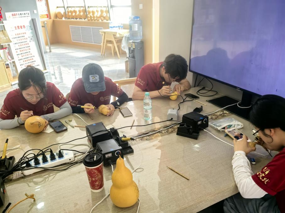 实践团师生走进俏葫芦艺术工作室非遗工坊,体验自治区级非遗项目——葫芦烙画。在非遗传承人指导下,师生们以烙铁为笔、葫芦为纸,在高温烙刻中学习体验“勾、皴、染、点”技艺。祥云纹、蒙古族盘肠纹、石榴籽图案在葫芦表面渐次浮现,传统纹样与现代创意碰撞出全新生命力。