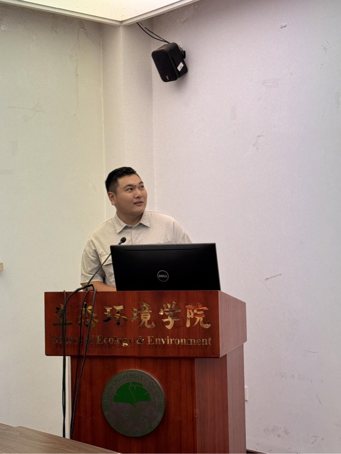 带队教师代表王翔宇发言。他回忆去年与师生们共同攀登梵净山、深入村庄农户,切实感受到生态旅游和生态产品在促进地方经济发展中的作用。今年,他与学生们共同学习南陵县在“两山”理念实践中的成功经验,深入探讨了如何实现生态资产的有效管理与生态价值的转化。在调研过程中,他们参观了扬子鳄保护区,走访了生态农业基地,亲身体验了莲子采摘的过程,感受到当地农户在绿色发展中所取得的实际成效。同时,他也特别提到,像护鳄人张晟这样默默奉献的基层环保工作者,始终坚守在生态保护的前线,为生态文明建设奠定了坚实的基础。王翔宇表示,通过这次调研,他深刻体会到生态保护和经济发展的协调统一是实现人与自然和谐共生的关键。他鼓励学生们将理论与实践相结合,用脚步丈量祖国大地,用实际行动践行生态文明理念,为中国的绿色发展贡献青春力量。