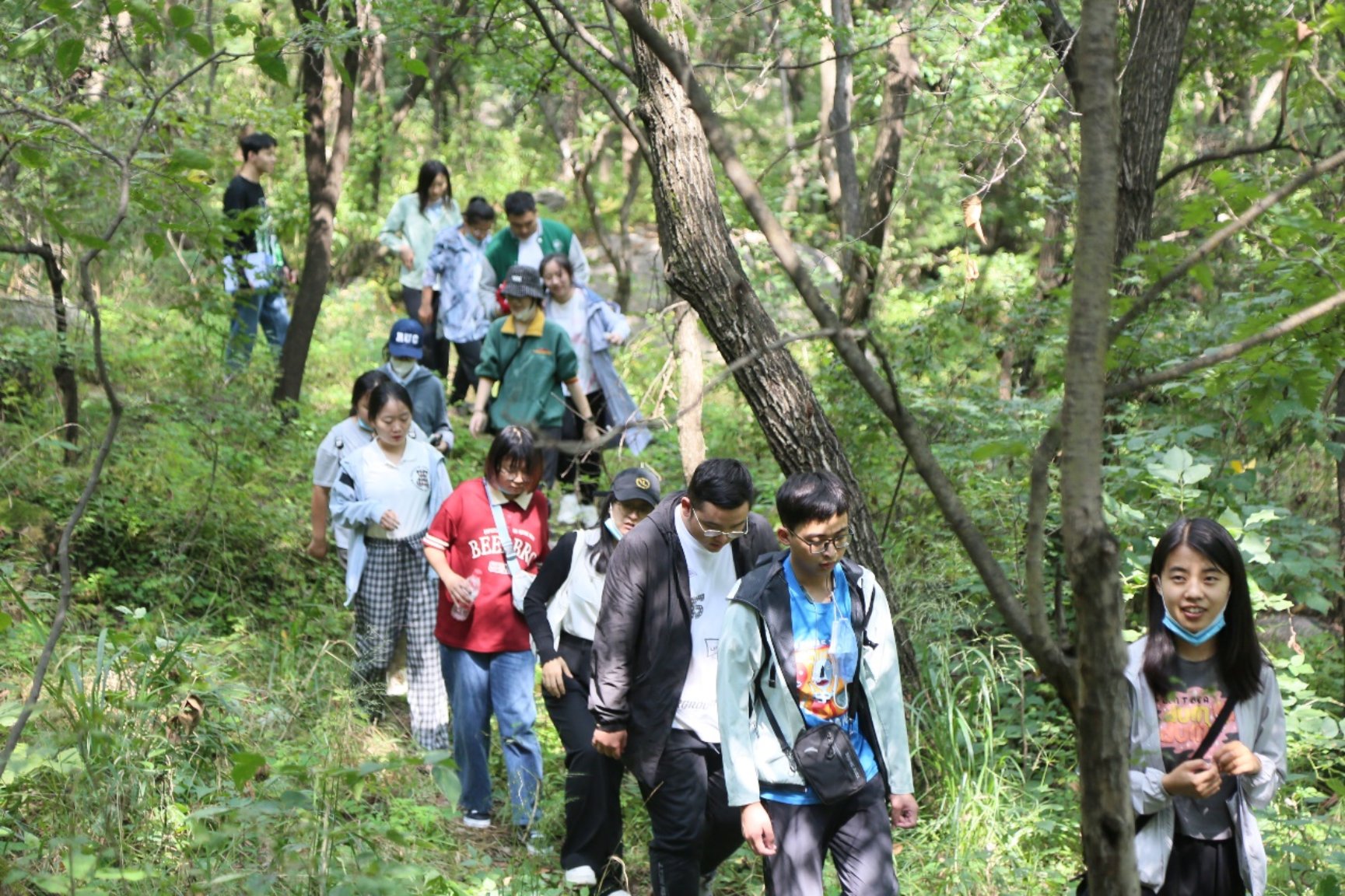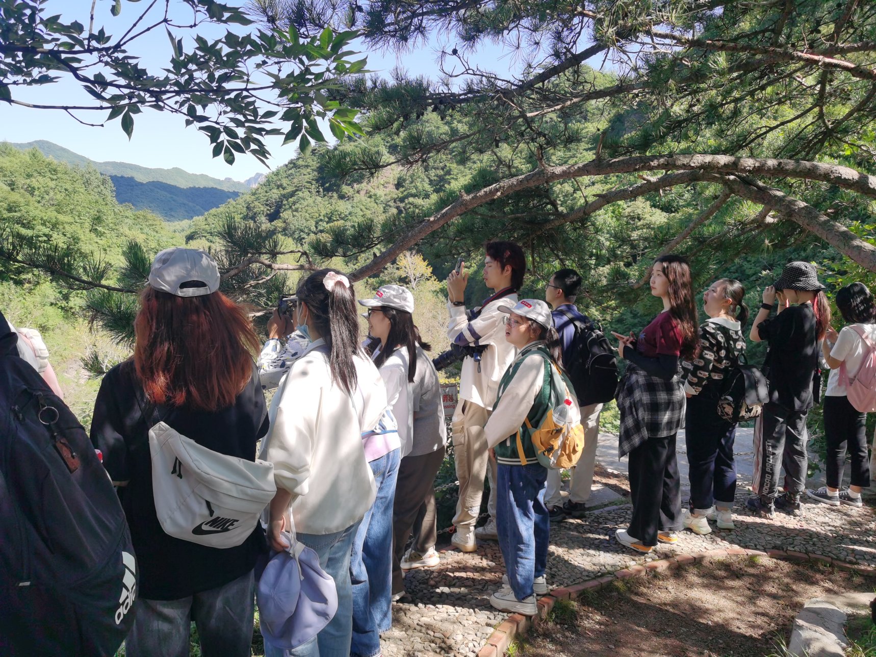 当天下午,在玉渡山管理站工作人员的带领下,实践团队前往玉渡山开展观鸟实践活动。沿着蜿蜒山路拾级而上,师生们走过合宜瀑布、忠心广场与三泉泻玉等多个自然景点,看到了雕鸮、野鸳鸯等珍惜鸟类,观察到了血松、火烧兰、北京水毛茛等特有植物。在庞军院长、马奔老师、丁霖老师以及工作人员的讲解下,同学们加深了对保护区的认识与了解,提高了环保意识。沿途中师生共同探讨环境问题,调研氛围轻松愉快。
