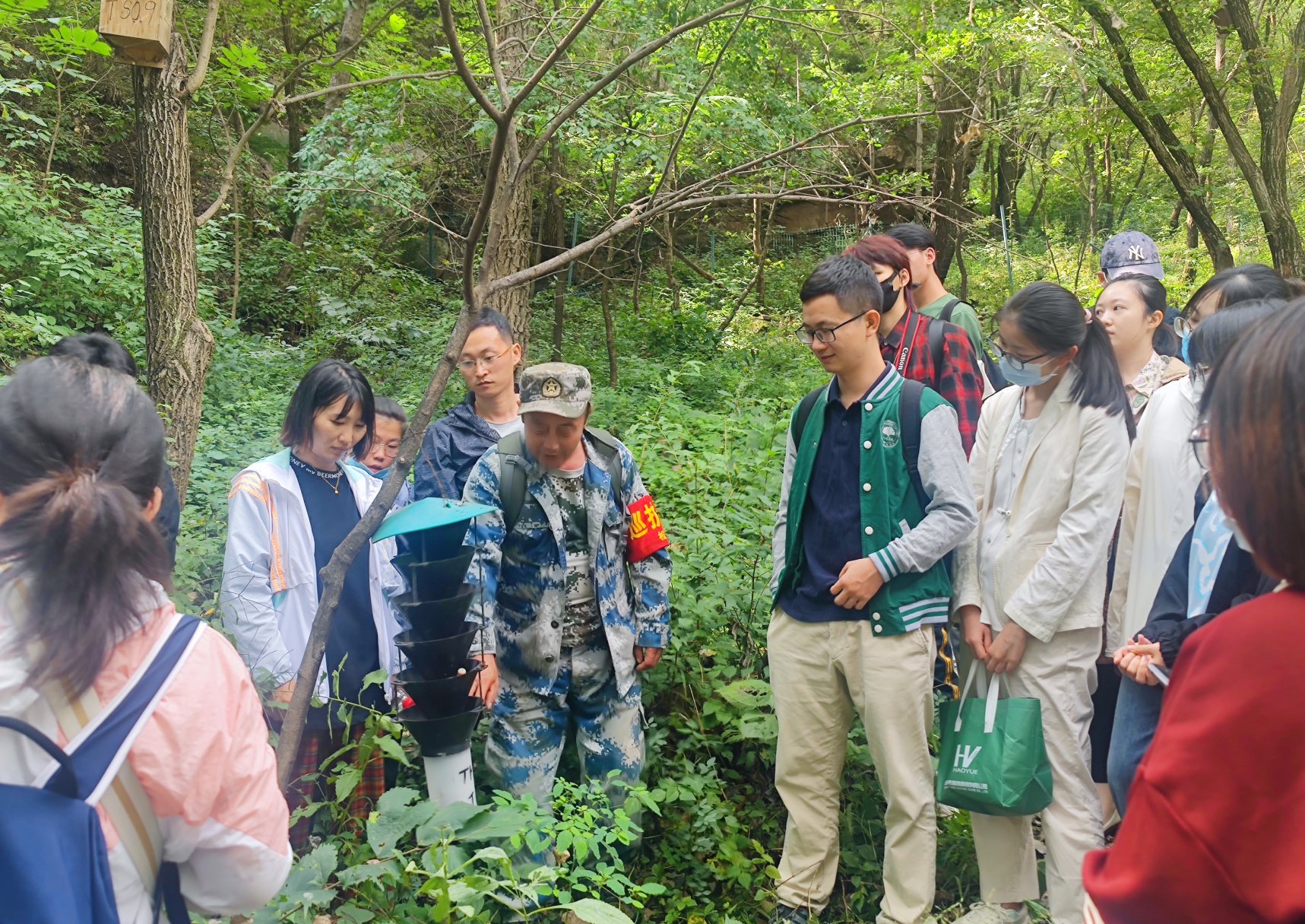 讲座和座谈交流环节结束后,在松山管理站工作人员带领下,师生一同参观了北京松山国家级自然保护区缓冲区地带。随着山间小路一直向上,同学们依次参观了红外线相机、人工鸟巢、害虫诱捕器以及马氏网昆虫诱捕器等设备,工作人员不时为大家介绍各种设备的作用机理。北京松山国家级自然保护区共设红外线相机222台,提供了不计其数的珍贵图片数据,同学们在现场透过摄像机,切身感受到了这个藏在大山里的隐秘世界。