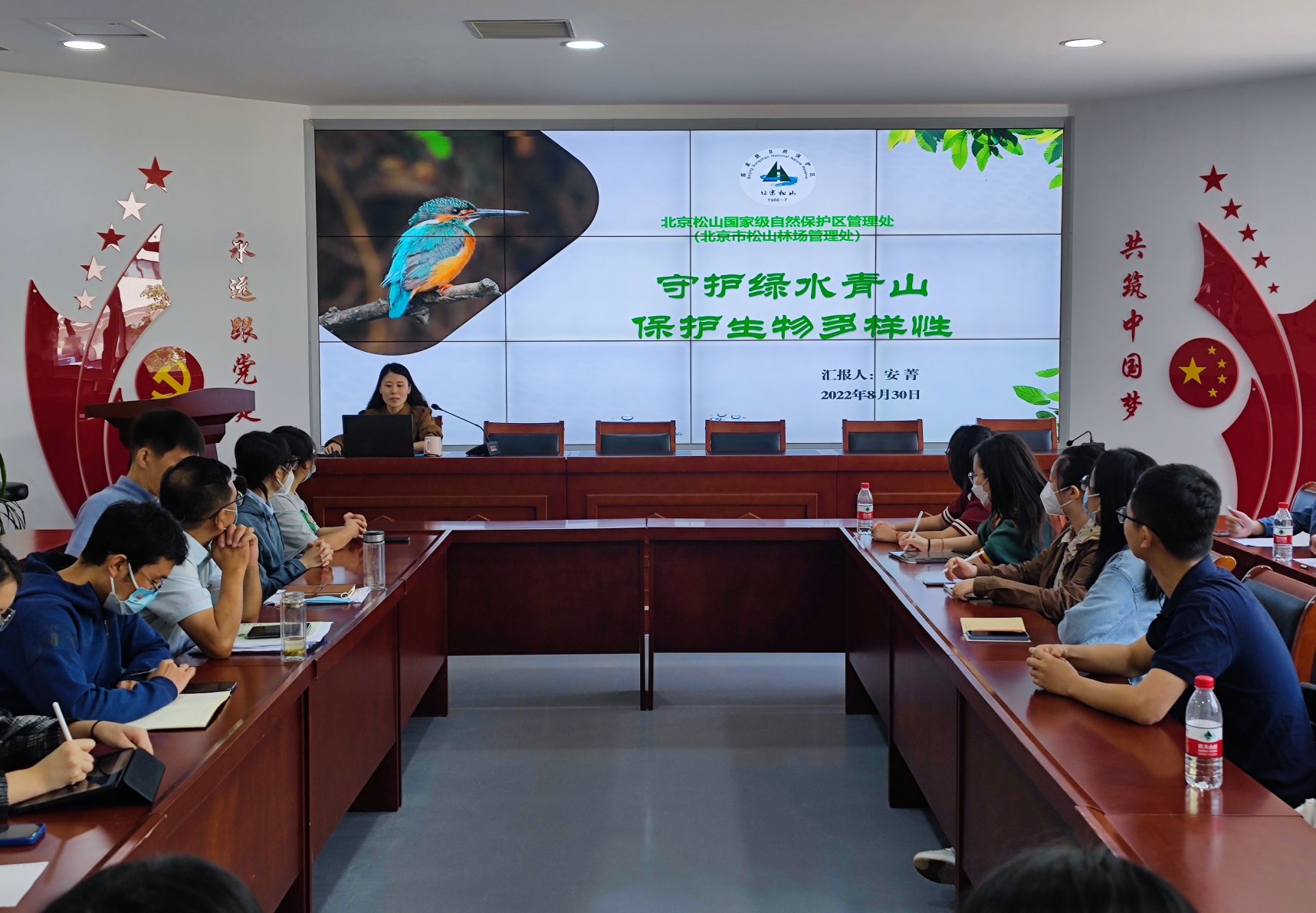 随后实践团队来到保护区管理处会议室,聆听了科普宣教科副科长安菁题为“守护绿水青山,保护生物多样性”的讲座。讲座分别从松山保护区基本情况和生物多样性保护两个方面,详细地向大家展示了保护区的全貌和功能、森林生态系统的监测及森林资源调查等。讲座内容既契合了实践成员所学的知识又妙趣横生,师生们认真做笔记,在学习的同时提高了保护生物多样性的意识。