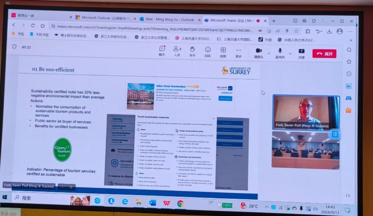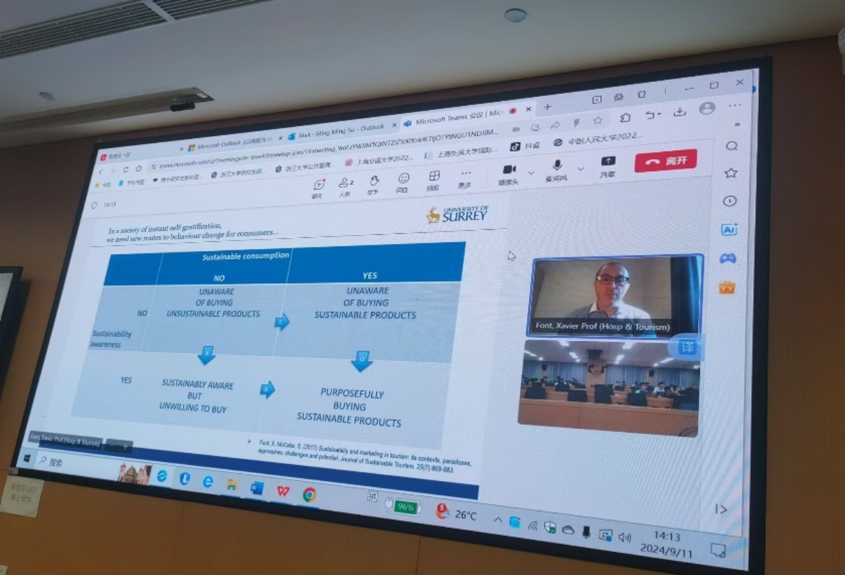 Font教授首先介绍了可持续实践的研究背景,即公众为可持续行为所做出的努力,但是仍然很难改变自己的行为。因此,需要新的途径来改变消费者的行为。Font教授依据可持续意识和可持续消费行为将消费者划分为四种类型。接着,他列举了以可持续为主题的酒店提供的服务,以及消费者期望得到的服务,由此,Font教授引出了可持续性无法完全实现的原因。他指出,在全球50家最大的酒店集团中,只有18家发布了企业社会责任报告,但他们没有回应利益相关者的期望,并且他们对可持续的宣传也经常会误导消费者。同时,旅游行业协会保护旅游企业免受外部压力,政府也很少收集有关旅游成本的数据,也不利用这些数据来做出政策决策。这些都会导致可持续的实践很难实现。在此基础上,Font教授提出了在旅游发展的背景下,可持续营销和沟通实践的目标。首先,每个政府都需要一个(真正的)可持续的旅游战略。其次,可持续实践的目标之一是环保,实现这一目标的行动方案包括鼓励酒店认证可持续发展、使可持续旅游产品和服务的消费正常化。可持续消费实践的目标之二是脱碳,这一目标可以通过减少旅行距离、增加停留时间、优化运输方式来实现。在这部分,Font教授还讨论了对目标市场的成本效益分析、市场上的巨大差异、对每个产品的成本效益分析。可持续消费实践的目标之三是正常化,特别是需要依据旅游者数量、旅游者访问频次、旅游类型做出合理的社会影响评估。可持续消费实践的目标之四是减少季节性,鼓励多样化市场和产品,改善交通方式、设计有创意的旅行、评估旅游影响等。可持续消费实践的目标之五是最优化,具体做法包括增加游客对目的地有利的产品和服务的支出、支持中小企业、支持平等、多样性和包容。